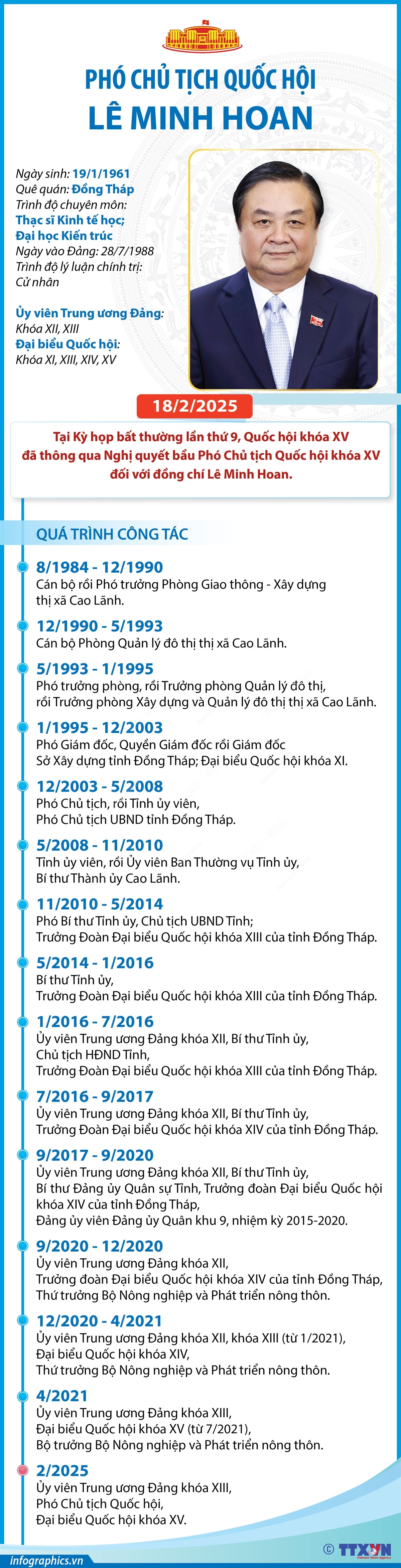 Ngày 18/2/2025, tại Kỳ họp bất thường lần thứ 9, Quốc hội khóa XV đã thông qua Nghị quyết bầu Phó Chủ tịch Quốc hội khóa XV đối với đồng chí Lê Minh Hoan.