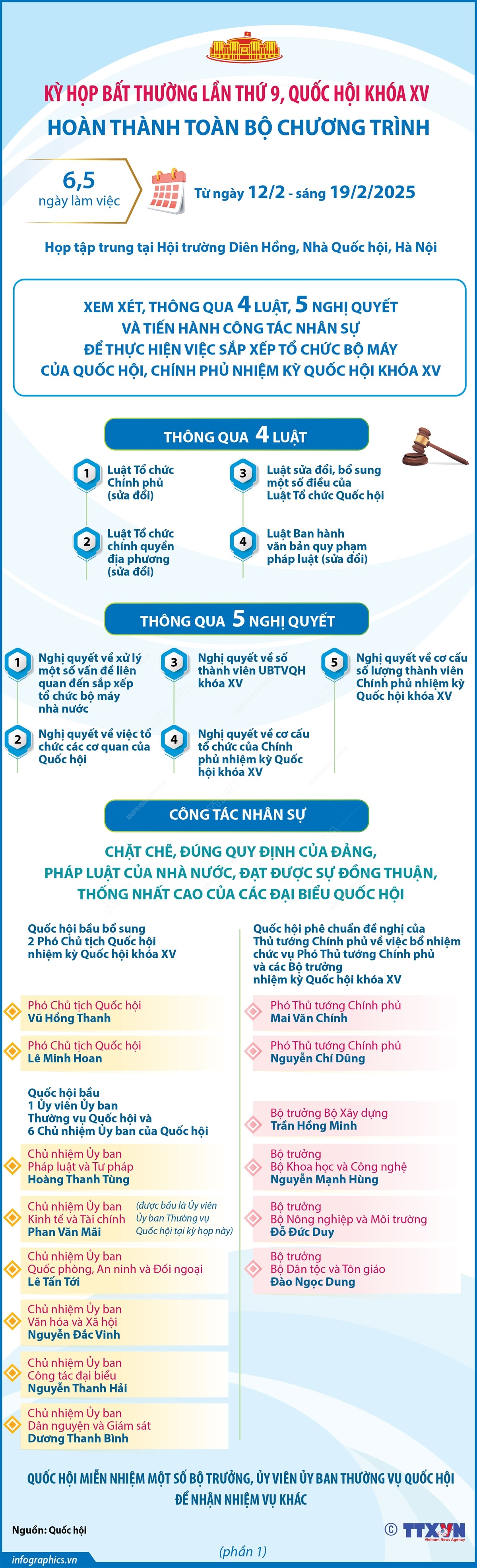 Sau 6,5 ngày làm việc (từ ngày 12 đến sáng ngày 19/2/2025) nghiêm túc, dân chủ, đổi mới, khoa học, trách nhiệm cao, Kỳ họp bất thường lần thứ 9, Quốc hội khóa XV đã hoàn thành toàn bộ chương trình với việc xem xét, thông qua 4 Luật, 5 Nghị quyết và tiến hành công tác nhân sự để thực hiện việc sắp xếp tổ chức bộ máy của Quốc hội, Chính phủ nhiệm kỳ Quốc hội khóa 15; thông qua 6 Nghị quyết nhằm thúc đẩy phát triển kinh tế-xã hội của đất nước và các cơ chế, chính sách đặc thù đối với một số dự án quan trọng.
