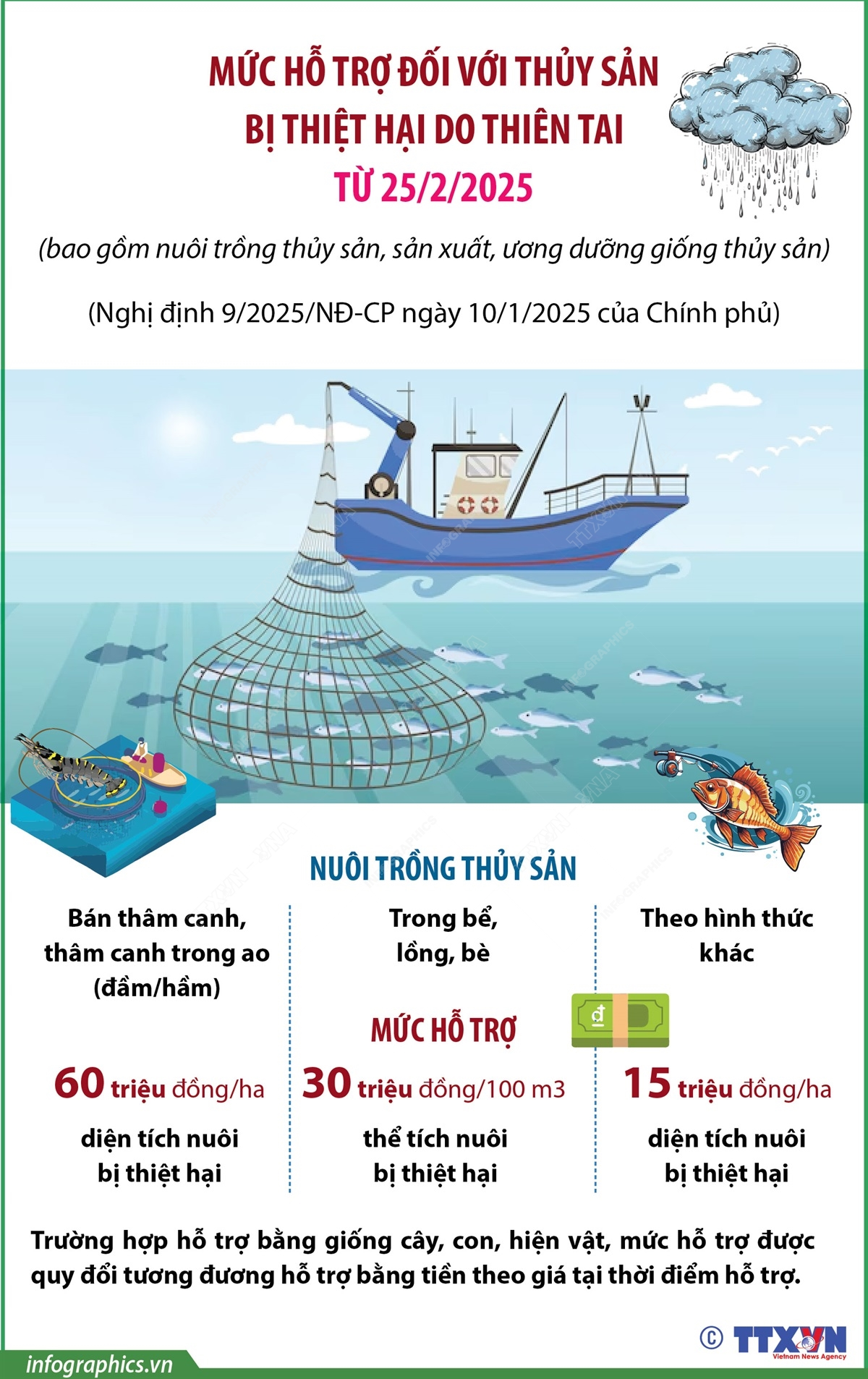 Theo Nghị định 9/2025/NĐ-CP, từ 25/2/2025, Chính phủ hỗ trợ đối với thủy sản bị thiệt hại do thiên tai (bao gồm nuôi trồng thuỷ sản, sản xuất, ương dưỡng giống thủy sản). Mức hỗ trợ cao nhất lên đến 60.000.000 đồng/ha.