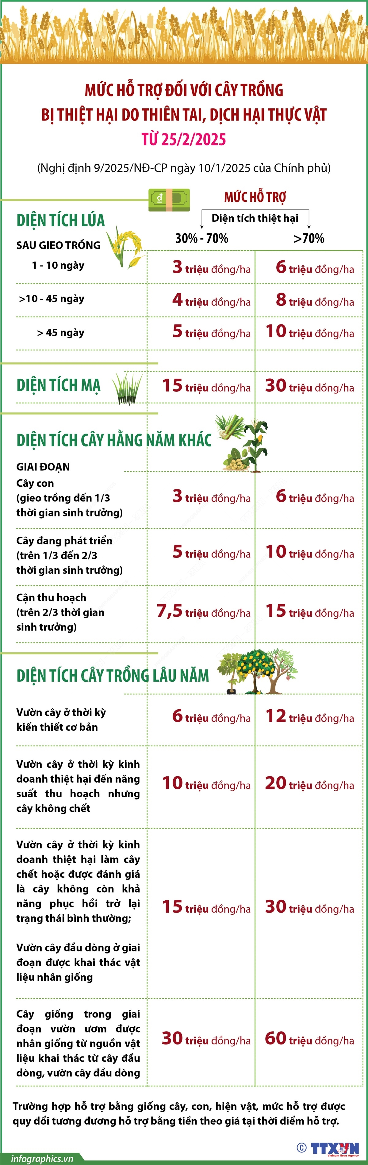 Theo Nghị định 9/2025/NĐ-CP, từ 25/2/2025, Chính phủ hỗ trợ đối với diện tích lúa, diện tích mạ, diện tích cây hằng năm khác, diện tích cây lâu năm bị thiệt hại do thiên tai, dịch hại thực vật. Số tiền hỗ trợ tùy thuộc vào loại cây, diện tích bị thiệt hại, mức thấp nhất là 3.000.000 đồng/ha, mức cao nhất là 70.000.000 đồng/ha.