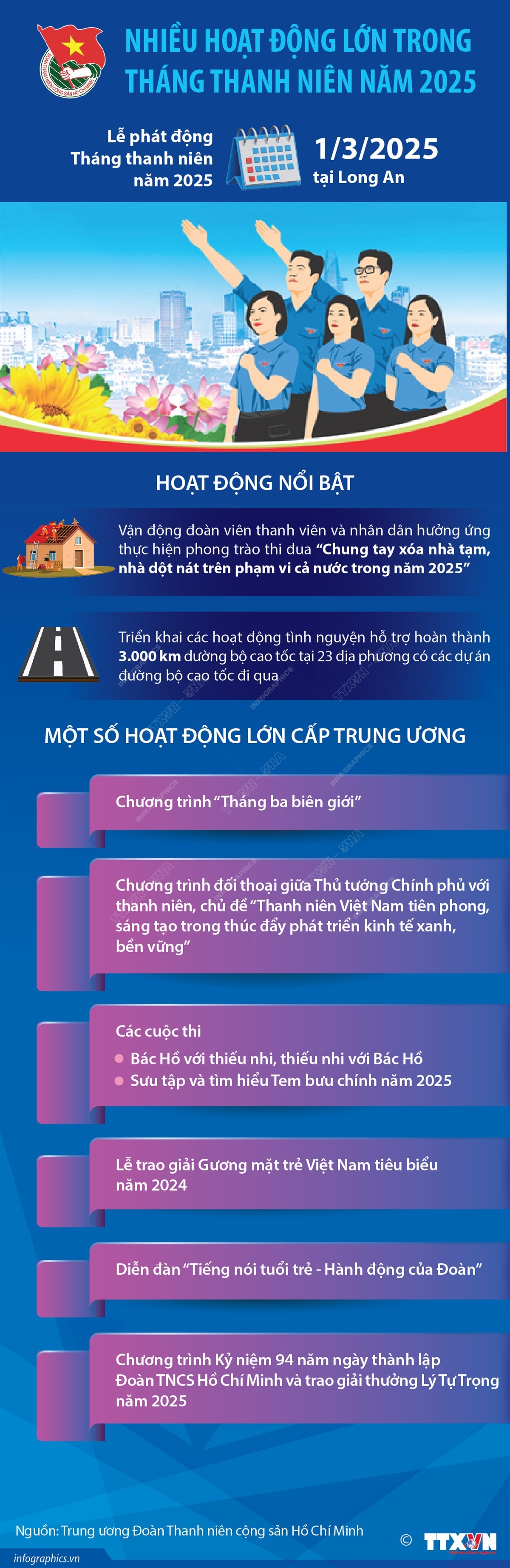 Ngày 1/3/2025, Lễ phát động Tháng Thanh niên năm 2025 do Trung ương Đoàn Thanh niên cộng sản Hồ Chí Minh diễn ra tại tỉnh Long An. Đây là hoạt động thiết thực chào mừng đại hội Đảng bộ các cấp, tiến tới Đại hội Đảng toàn quốc lần thứ XIV; hướng tới kỷ niệm 94 năm ngày thành lập Đoàn Thanh niên cộng sản Hồ Chí Minh (26/3/1931- 26/3/2025).