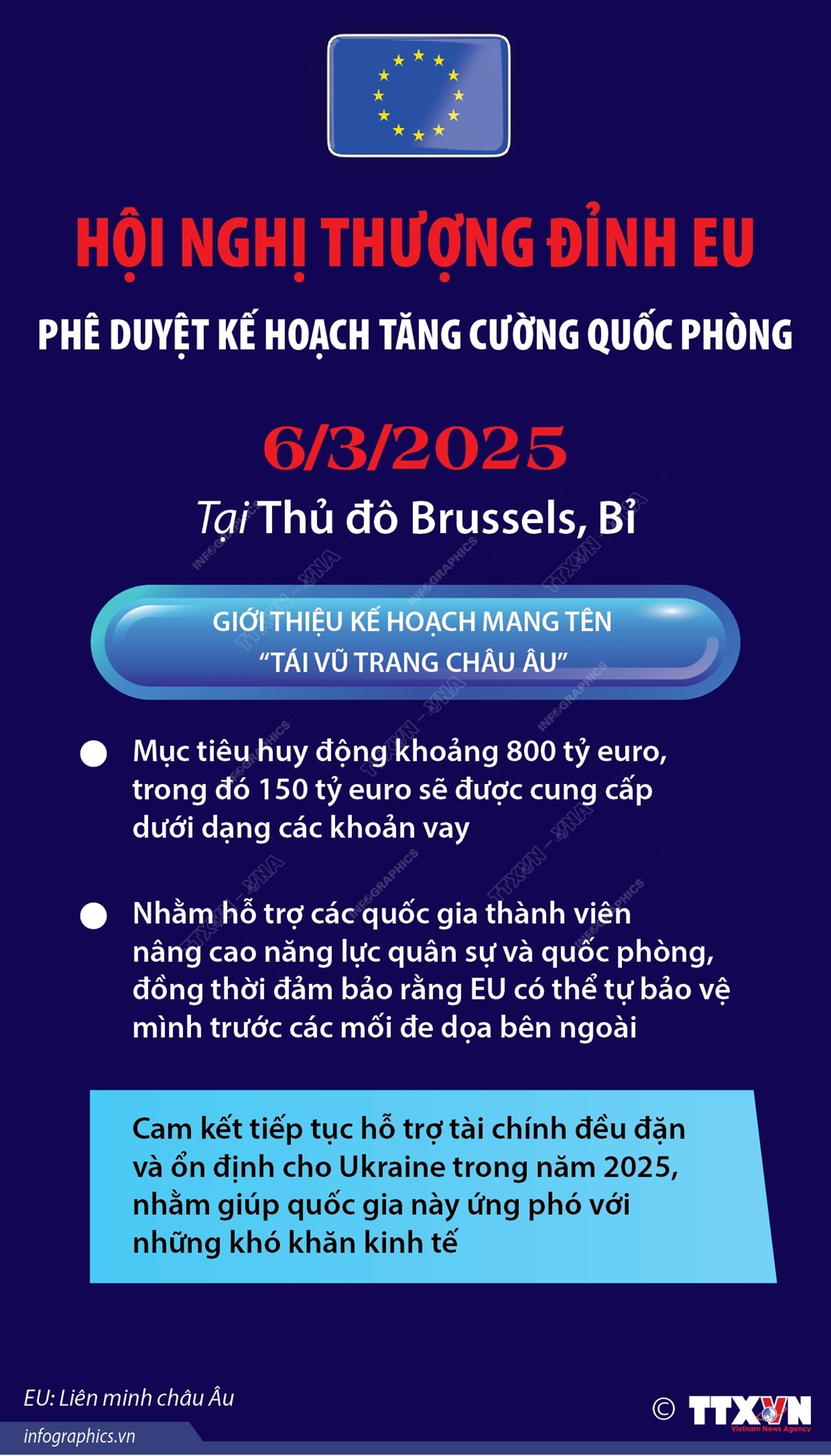 Tại hội nghị thượng đỉnh đặc biệt ở Brussels ngày 6/3/2025, các nhà lãnh đạo của 27 quốc gia thành viên Liên minh châu Âu (EU) đã thông qua kế hoạch của Ủy ban châu Âu (EC) nhằm tăng cường quốc phòng cho toàn bộ lục địa, với một quỹ lên tới 800 tỷ euro. Đây là bước đi quan trọng nhằm củng cố khả năng phòng thủ của EU trong bối cảnh tình hình căng thẳng toàn cầu.