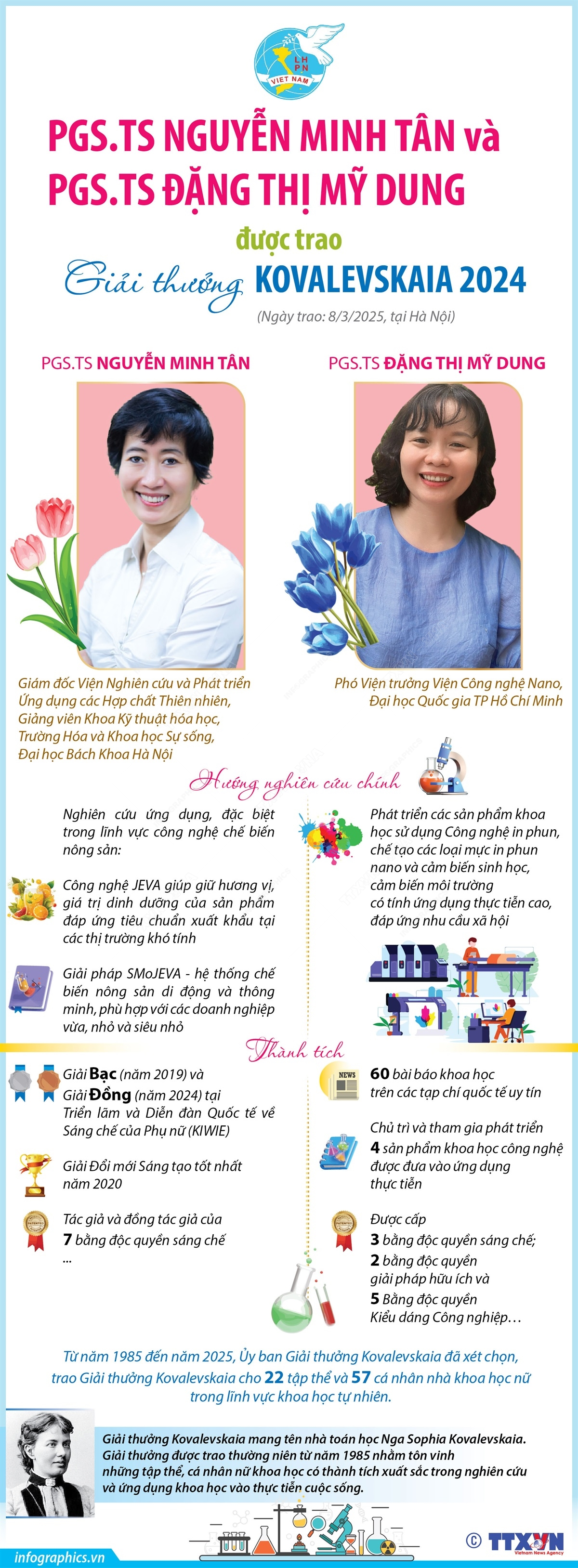 Giải thưởng Kovalevskaia năm 2024 được trao cho 2 nhà khoa học nữ là PGS.TS Nguyễn Minh Tân - Giám đốc Viện Nghiên cứu và Phát triển Ứng dụng các Hợp chất Thiên nhiên, Giảng viên Khoa Kỹ thuật Hóa học, Trường Hóa và Khoa học Sự sống, Đại học Bách Khoa Hà Nội và PGS.TS Đặng Thị Mỹ Dung - Phó Viện trưởng Viện Công nghệ Nano, Đại học Quốc gia TP Hồ Chí Minh, với những thành tích xuất sắc trong nghiên cứu khoa học và ứng dụng thực tiễn, đóng góp quan trọng góp phần vào sự phát triển của đơn vị, của ngành, nhiều kết quả nghiên cứu đi vào ứng dụng thực tiễn, chuyển giao công nghệ hàng tỉ đồng cho các doanh nghiệp tại Việt Nam.