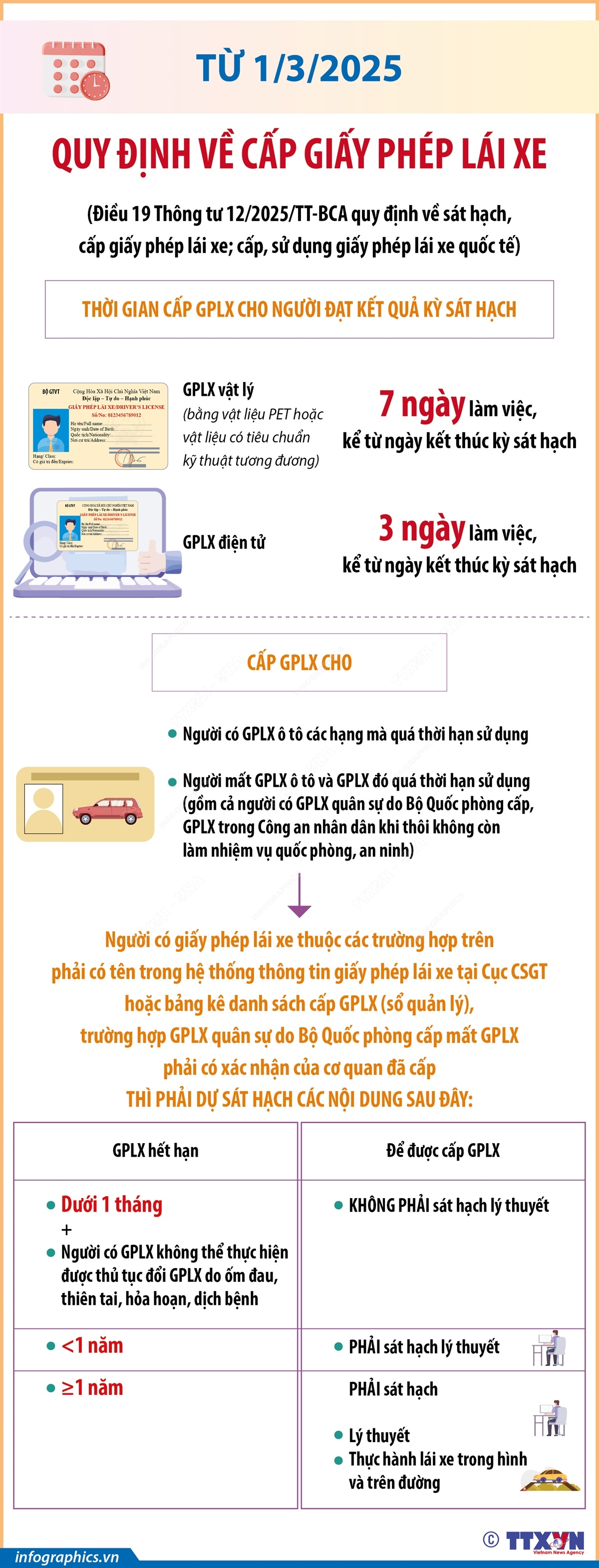 Theo Điều 19 Thông tư 12/2025/TT-BCA của Bộ Công an, từ 1/3/2025, thời hạn cấp Giấy phép lái xe (GPLX) vật lý là 7 ngày làm việc; GPLX điện tử là 3 ngày, kể từ ngày kết thúc kỳ sát hạch. Trường hợp GPLX quá thời hạn sử dụng dưới 1 tháng kể từ ngày hết hạn mà người có GPLX không thể thực hiện được thủ tục đổi GPLX do ốm đau, thiên tai, hỏa hoạn, dịch bệnh thì người đó không phải sát hạch lý thuyết để cấp GPLX theo quy định. Trường hợp GPLX quá thời hạn sử dụng dưới 1 năm thì phải sát hạch lý thuyết; trên 1 năm thì phải sát hạch lý thuyết, thực hành lái xe trong hình và trên đường để cấp GPLX theo quy định.