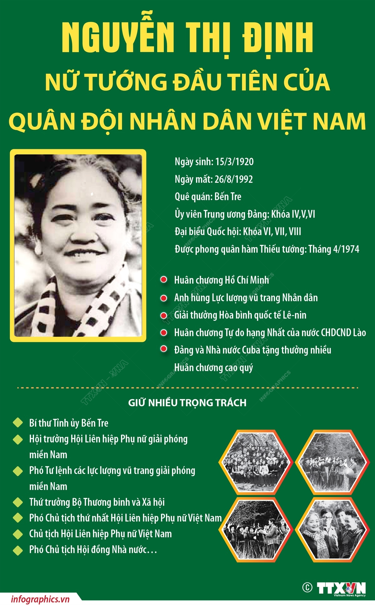 Tên tuổi Thiếu tướng Nguyễn Thị Định - nữ tướng của Thời đại Hồ Chí Minh đã đi vào lịch sử như một huyền thoại. Cuộc đời, sự nghiệp, khí chất, tinh hoa của bà gắn với cách mạng, với Nam bộ, với cuộc Đồng khởi Bến Tre vang dội, với “Đội quân tóc dài”, đội Quân Giải phóng anh hùng... Với những cống hiến đặc biệt xuất sắc, bà được Đảng, Nhà nước tặng thưởng Huân chương Hồ Chí Minh, Huân chương Quân công hạng Nhất, Anh hùng Lực lượng vũ trang Nhân dân… Thiếu tướng Nguyễn Thị Định sinh ngày 15/3/1920, cách đây 105 năm.