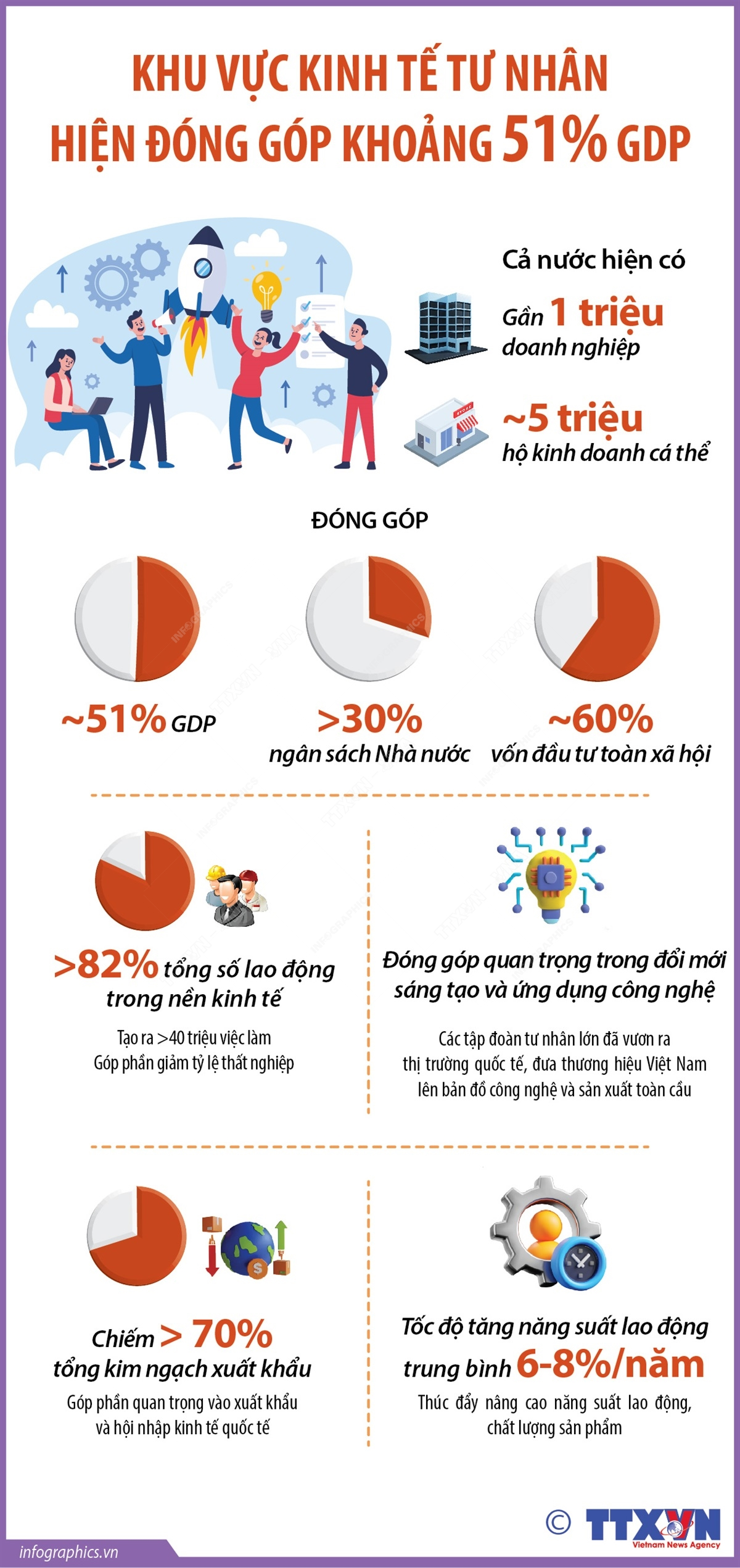 Với gần một triệu doanh nghiệp, khoảng 5 triệu hộ kinh doanh cá thể, khu vực kinh tế tư nhân hiện đóng góp khoảng 51% GDP, hơn 3 0% ngân sách nhà nước, tạo ra hơn 40 triệu việc làm, sử dụng hơn 82% tổng số lao động trong nền kinh tế, đóng góp gần 60% vốn đầu tư toàn xã hội. Kinh tế tư nhân không chỉ giúp mở rộng sản xuất, thương mại, dịch vụ mà còn góp phần quan trọng trong việc nâng cao năng suất lao động, thúc đẩy đổi mới sáng tạo và tăng cường năng lực cạnh tranh quốc gia. Nhiều doanh nghiệp tư nhân tăng mạnh mẽ, không chỉ làm chủ thị trường nội địa mà còn khẳng định thương hiệu Việt Nam trên thị trường quốc tế…