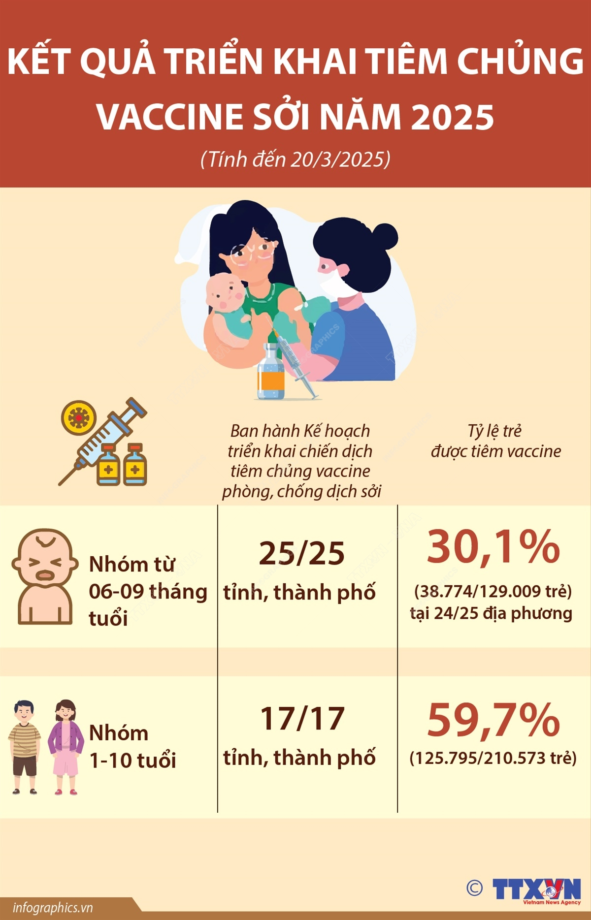 Tính từ đầu năm 2025 đến 20/3/2025, 17/17 tỉnh, thành phố đã ban hành kế hoạch tiêm vaccine sởi cho trẻ từ 1-10 tuổi, 125.795/210.573 trẻ 1-10 tuổi đã được tiêm chủng, đạt 59,7%. 25/25 tỉnh, thành phố đã ban hành Kế hoạch tiêm cho trẻ 06-09 tháng tuổi, 38.774/129.009 trẻ 06-09 tháng tuổi được tiêm chủng tại 24/25 địa phương, đạt 30,1%.