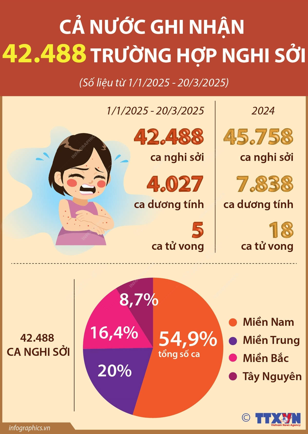 Từ đầu năm 2025 đến 20/3/2025, cả nước ghi nhận rải rác 42.488 trường hợp nghi sởi tại 63 tỉnh, thành phố, trong đó có 4.027 trường hợp dương tính với sởi tại 62 tỉnh, thành phố; 05 trường hợp tử vong liên quan đến sởi tại TP. Hồ Chí Minh (02), Đồng Nai (01), Bình Dương (01) và Bình Phước (1); số mắc tăng cao so với cùng kỳ năm 2024 (111 trường hợp). Số trường hợp nghi sởi ghi nhận cao nhất tại khu vực miền Nam (54,9%), miền Trung (20%), miền Bắc (16,4%), Tây Nguyên (8,7%).