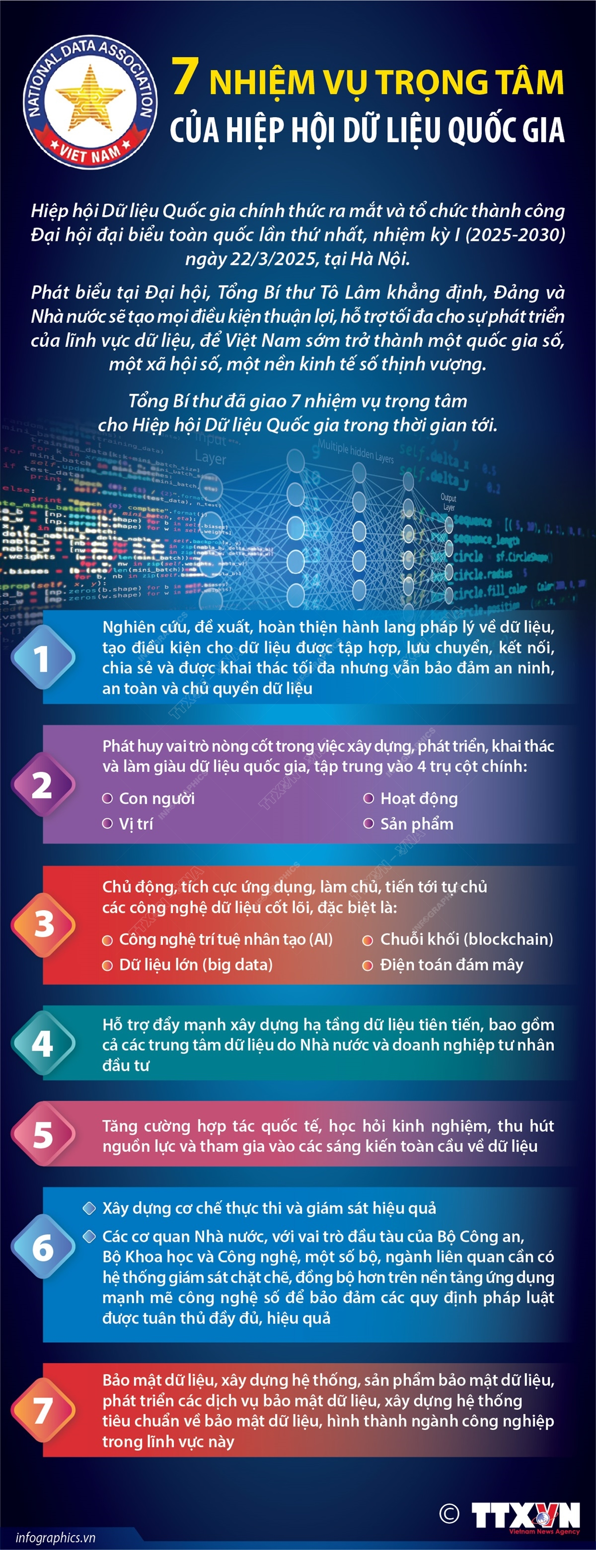 Hiệp hội Dữ liệu Quốc gia chính thức ra mắt và tổ chức thành công Đại hội đại biểu toàn quốc lần thứ nhất, nhiệm kỳ I (2025-2030) ngày 22/3/2025, tại Hà Nội. Phát biểu tại Đại hội, Tổng Bí thư Tô Lâm khẳng định, Đảng và Nhà nước sẽ tạo mọi điều kiện thuận lợi, hỗ trợ tối đa cho sự phát triển của lĩnh vực dữ liệu, để Việt Nam sớm trở thành một quốc gia số, một xã hội số, một nền kinh tế số thịnh vượng. Tổng Bí thư đã giao 7 nhiệm vụ trọng tâm cho Hiệp hội Dữ liệu Quốc gia trong thời gian tới.