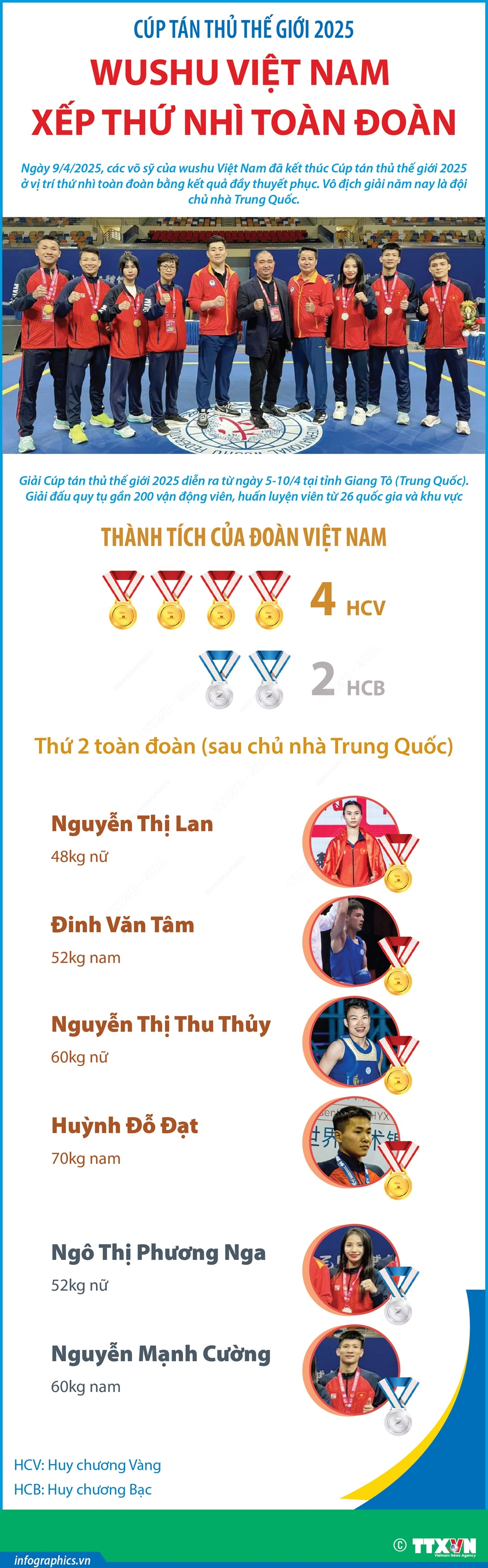 Các võ sỹ của wushu Việt Nam đã kết thúc Cúp tán thủ thế giới 2025 ở vị trí thứ nhì toàn đoàn bằng kết quả đầy thuyết phục. Vô địch giải năm nay là đội chủ nhà Trung Quốc. Giải Cúp tán thủ thế giới 2025 diễn ra từ ngày 5-10/4 tại tỉnh Giang Tô (Trung Quốc), quy tụ gần 200 vận động viên điền kinh, huấn luyện viên từ 26 quốc gia và khu vực.