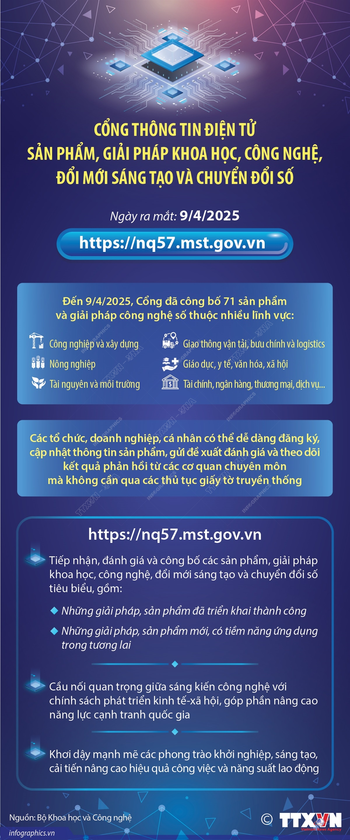 Cổng thông tin điện tử sản phẩm, giải pháp khoa học, công nghệ, đổi mới sáng tạo và chuyển đổi số được Bộ Khoa học và Công nghệ ra mắt ngày 9/4/2025 tại địa chỉ https://nq57.mst.gov.vn. Đây là một sự kiện quan trọng nhằm triển khai thực hiện Nghị quyết số 57-NQ/TW ngày 22/12/2024 của Bộ Chính trị, góp phần thúc đẩy hệ sinh thái khoa học, công nghệ, đổi mới sáng tạo và chuyển đổi số quốc gia.
