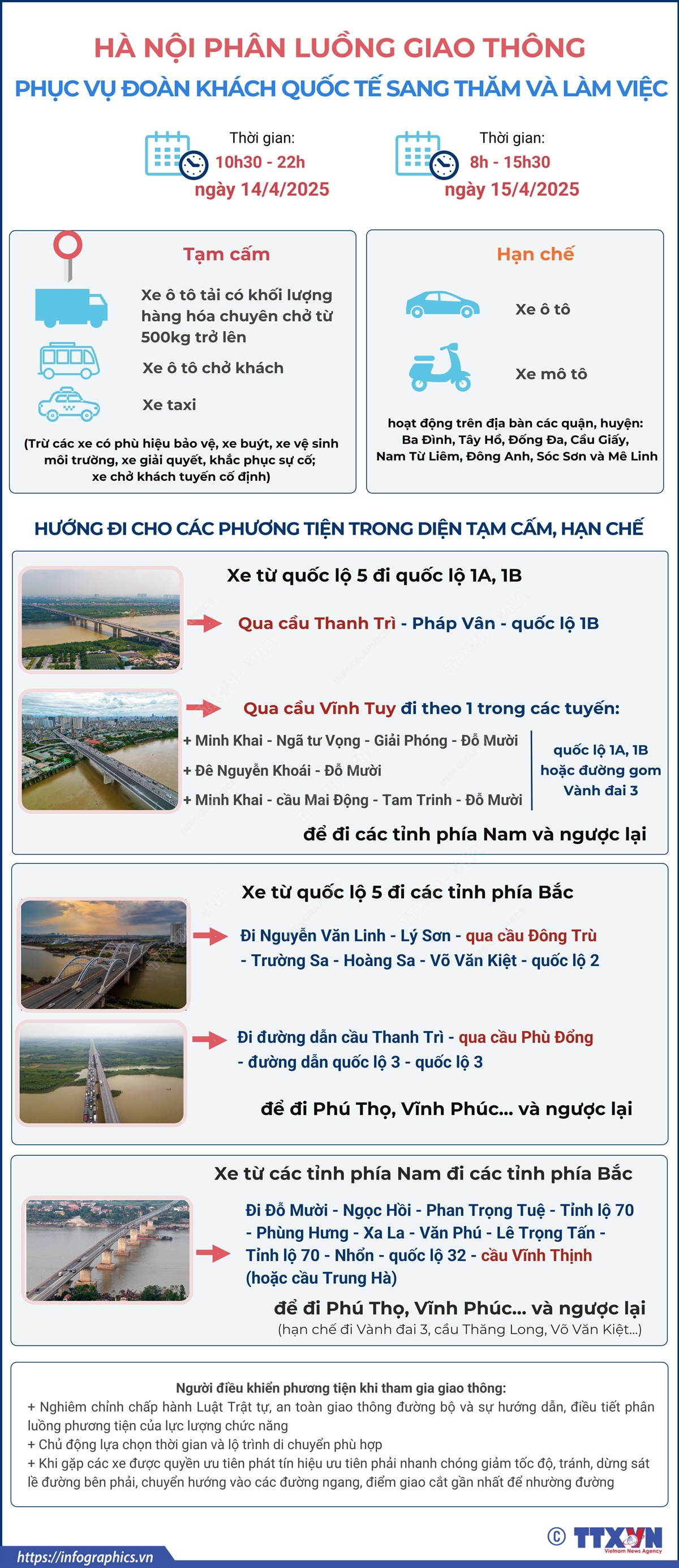 Trong hai ngày 14 và 15/4/2025, trên địa bàn thành phố Hà Nội diễn ra hoạt động của các đoàn khách quốc tế sang thăm và làm việc tại Việt Nam. Để bảo đảm an ninh, an toàn và giao thông thông suốt phục vụ công tác bảo vệ đoàn khách quốc tế, Công an thành phố Hà Nội thông báo phân luồng giao thông và tổ chức hướng đi cho các loại phương tiện.