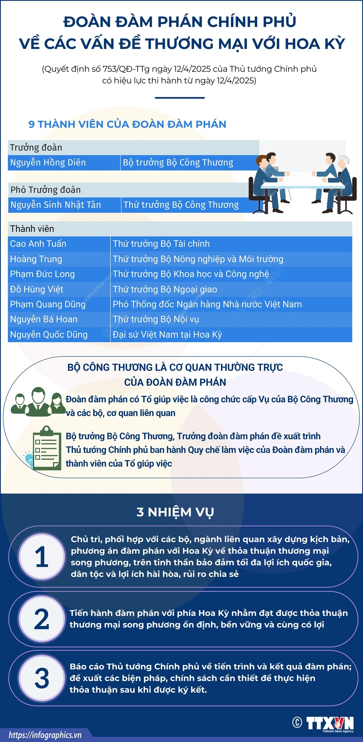 Thủ tướng Chính phủ Phạm Minh Chính đã ký ban hành Quyết định số 753/QĐ-TTg ngày 12/4/2025 về việc thành lập Đoàn đàm phán Chính phủ về các vấn đề thương mại với Hoa Kỳ.