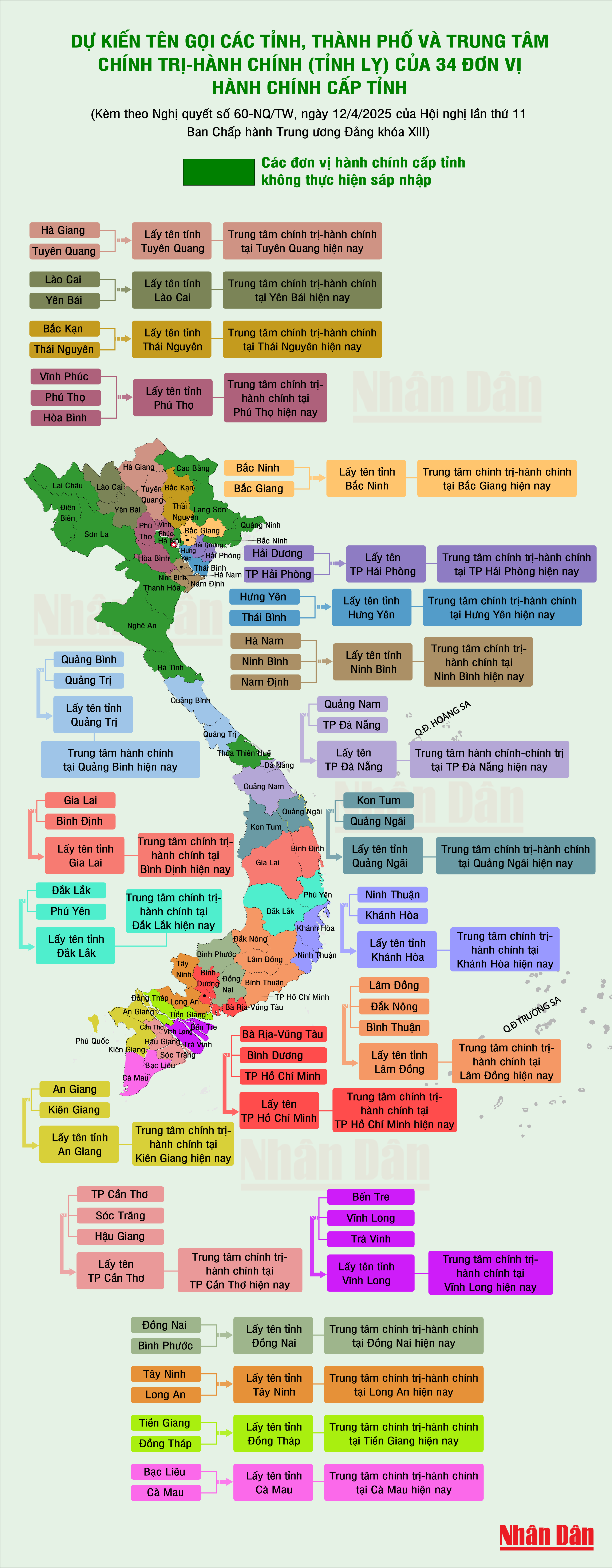 Tên gọi dự kiến của các tỉnh, thành phố và trung tâm chính trị-hành chính (tỉnh lỵ) của 34 đơn vị hành chính cấp tỉnh (Kèm theo Nghị quyết số 60-NQ/TW, ngày 12/4/2025 của Hội nghị lần thứ 11 Ban Chấp hành Trung ương Đảng khóa XIII).
