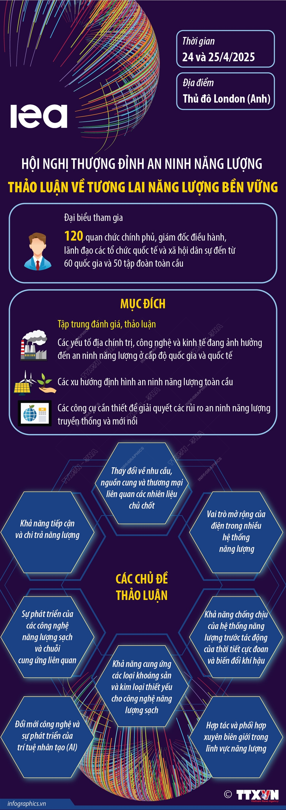Hội nghị thượng đỉnh của Cơ quan Năng lượng Quốc tế (IEA) về tương lai an ninh năng lượng diễn ra tại thủ đô London (Anh) trong hai ngày 24 và 25//4/2025 (giờ địa phương). Sự kiện quy tụ 120 quan chức chính phủ, giám đốc điều hành, lãnh đạo các tổ chức quốc tế và xã hội dân sự đến từ 60 quốc gia và 50 tập đoàn toàn cầu, nhằm thảo luận về tương lai năng lượng bền vững, đồng thời thúc đẩy đồng thuận quốc tế trong xử lý các rủi ro an ninh năng lượng truyền thống và mới nổi.