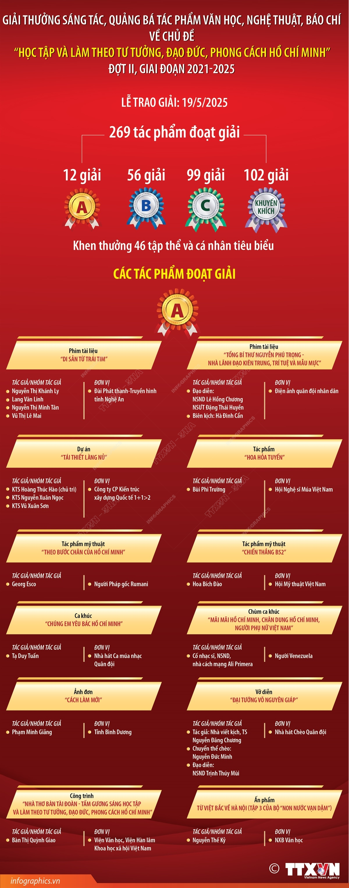Lễ Trao giải thưởng sáng tác, quảng bá tác phẩm văn học, nghệ thuật, báo chí về chủ đề “Học tập và làm theo tư tưởng, đạo đức, phong cách Hồ Chí Minh” đợt 2, giai đoạn 2021-2025 do Ban Tuyên giáo và Dân vận Trung ương phối hợp với Đài Truyền hình Việt Nam tổ chức diễn ra tối 19/5/2025, tại Hà Nội. Hội đồng chấm giải đã xét 269 tác phẩm và lựa chọn trao 12 giải A, 56 giải B, 99 giải C và 102 giải Khuyến khích; đồng thời đề nghị khen thưởng thành tích xuất sắc đối với 46 tập thể, cá nhân tiêu biểu trong hoạt động quảng bá. Đây là những minh chứng cho sức sống bền bỉ và lan tỏa của các giá trị mà Bác Hồ để lại. Giải thưởng không chỉ tôn vinh tác phẩm mà còn tôn vinh những con người đang ngày ngày góp phần làm theo Bác bằng chính ngòi bút, ống kính và lời ca của mình, góp phần xây dựng và phát triển văn hóa con người Việt Nam trong thời đại mới.