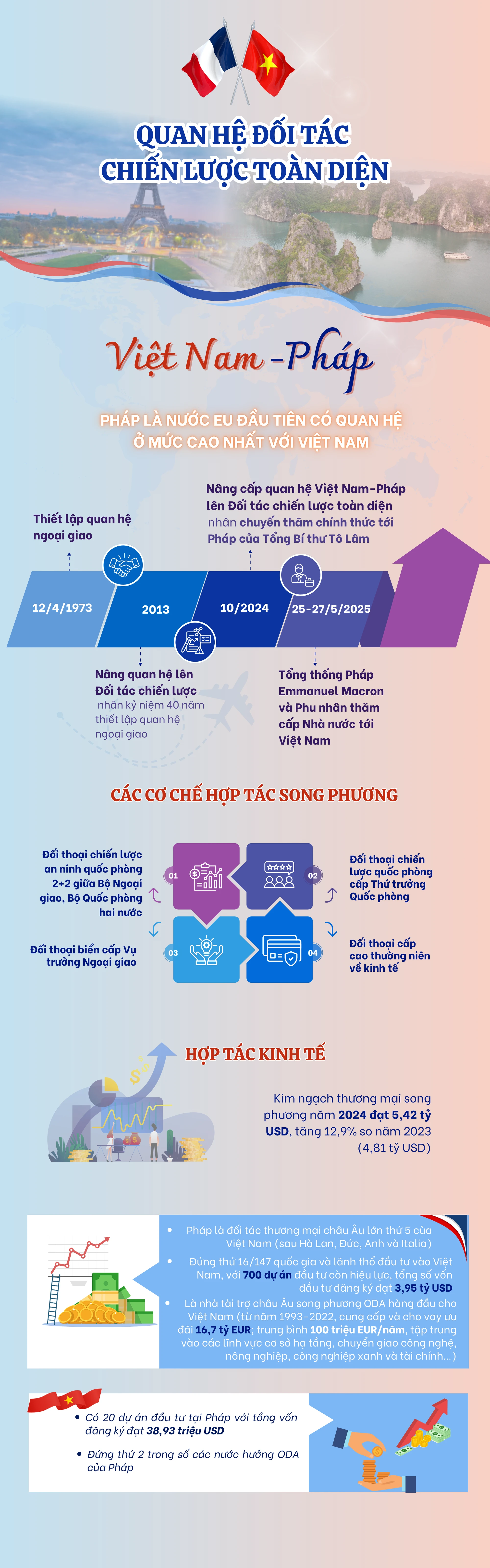 Việt Nam và Pháp thiết lập quan hệ ngoại giao từ năm 1973. Với bề dày lịch sử quan hệ và hợp tác sâu rộng trên nhiều lĩnh vực, năm 2024, hai nước nâng cấp quan hệ lên Đối tác chiến lược toàn diện, đưa Pháp trở thành nước EU đầu tiên có quan hệ ở mức cao nhất với Việt Nam.
