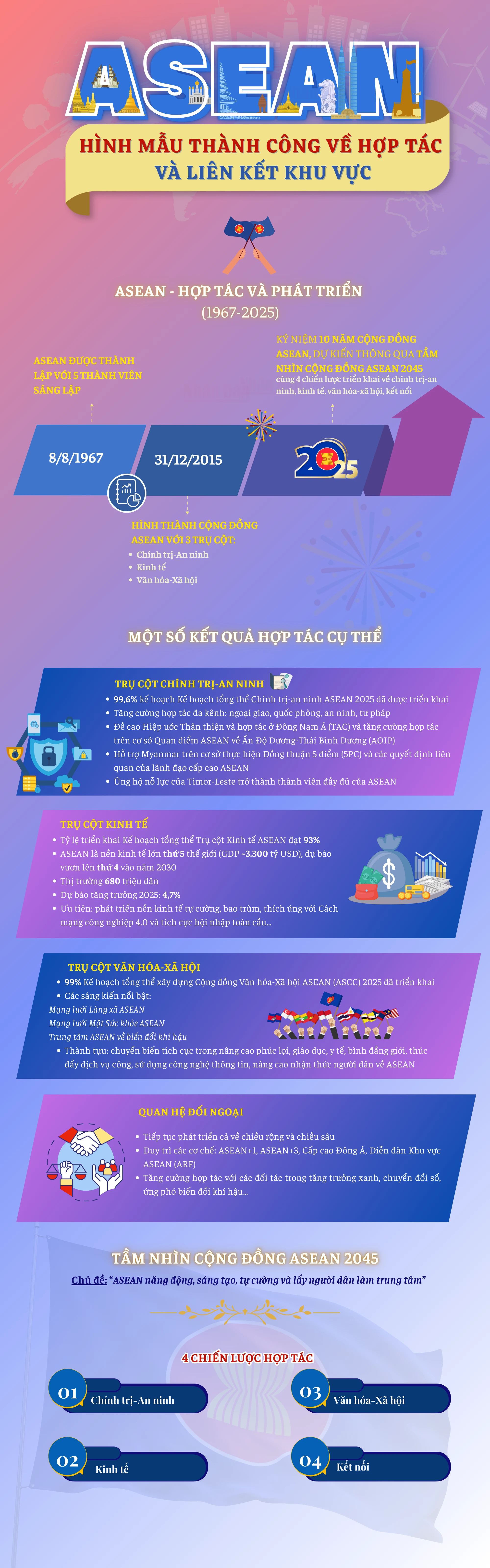 Sau gần 6 thập kỷ hình thành và phát triển, ASEAN đã khẳng định là hình mẫu thành công về hợp tác và liên kết khu vực, với vai trò và uy tín ngày càng cao. ASEAN đẩy mạnh hợp tác nội khối, mở rộng và tăng cường quan hệ với nhiều đối tác trên thế giới, khởi xướng và giữ vai trò chủ đạo trong nhiều cơ chế hợp tác khu vực.