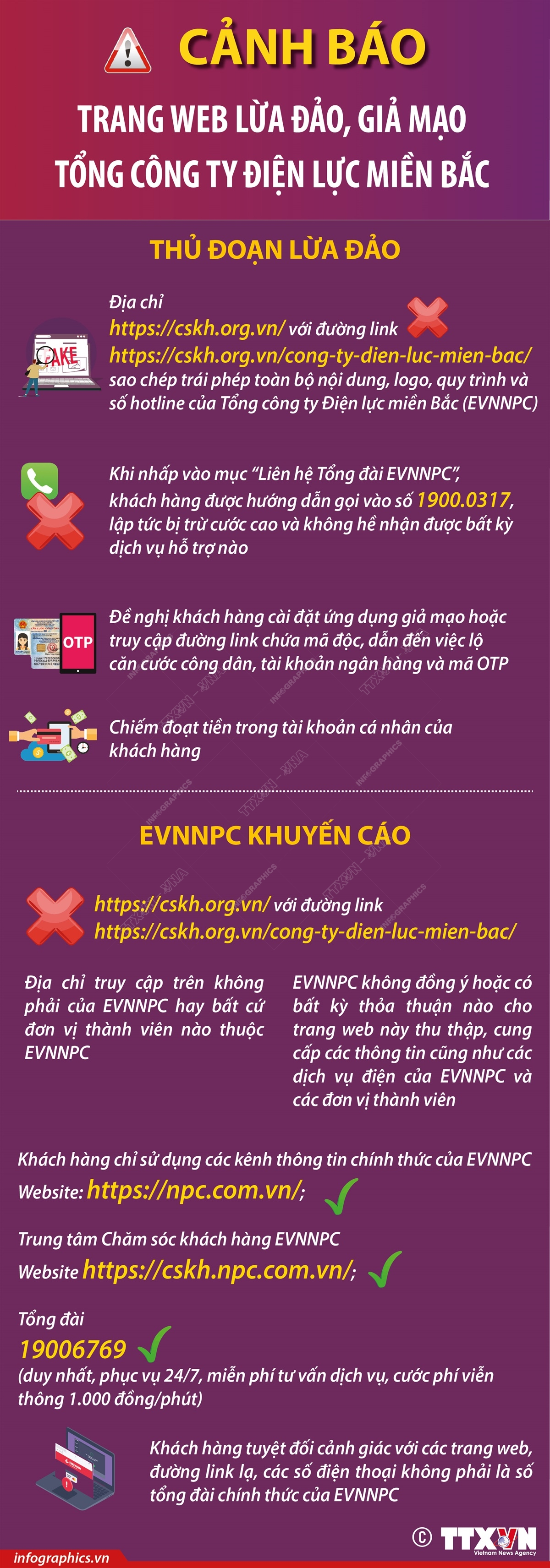 Theo Tổng công ty Điện lực miền Bắc (EVNNPC), trong thời gian gần đây, bên cạnh nhiều chiêu thức mạo danh nhân viên ngành điện lừa đảo qua điện thoại ngày càng tinh vi còn xuất hiện nhiều trang web giả mạo ngành điện, tư vấn khách hàng gọi đến số tổng đài chăm sóc khách hàng với cước phí cuộc gọi cao gấp 8 lần.