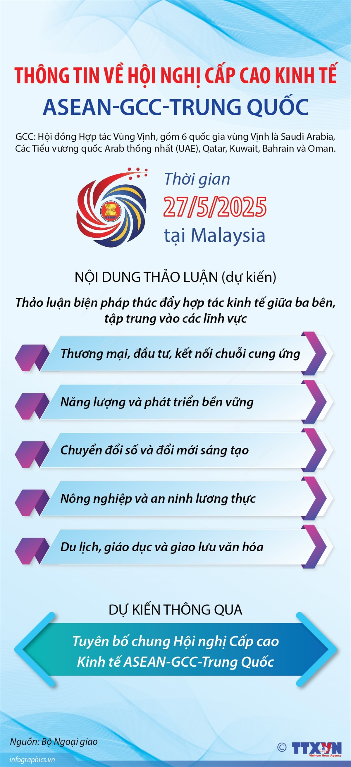 Hội nghị Cấp cao Kinh tế ASEAN-GCC-Trung Quốc diễn ra dịp Hội nghị Cấp cao ASEAN lần thứ 46 vào ngày 26 và 27/5/2025 tại Malaysia, cùng với Hội nghị Cấp cao ASEAN-GCC lần thứ hai. Đây là Hội nghị Cấp cao đầu tiên giữa ASEAN, GCC và Trung Quốc. Dự kiến, các Nhà Lãnh đạo sẽ thảo luận biện pháp thúc đẩy hợp tác kinh tế giữa ba bên, tập trung vào các lĩnh vực như thương mại, đầu tư, kết nối chuỗi cung ứng; năng lượng và phát triển bền vững; chuyển đổi số và đổi mới sáng tạo; nông nghiệp và an ninh lương thực; du lịch, giáo dục và giao lưu văn hóa. Hội nghị dự kiến sẽ thông qua Tuyên bố chung Hội nghị Cấp cao Kinh tế ASEAN-GCC-Trung Quốc nhằm khẳng định cam kết hợp tác giữa ba bên.