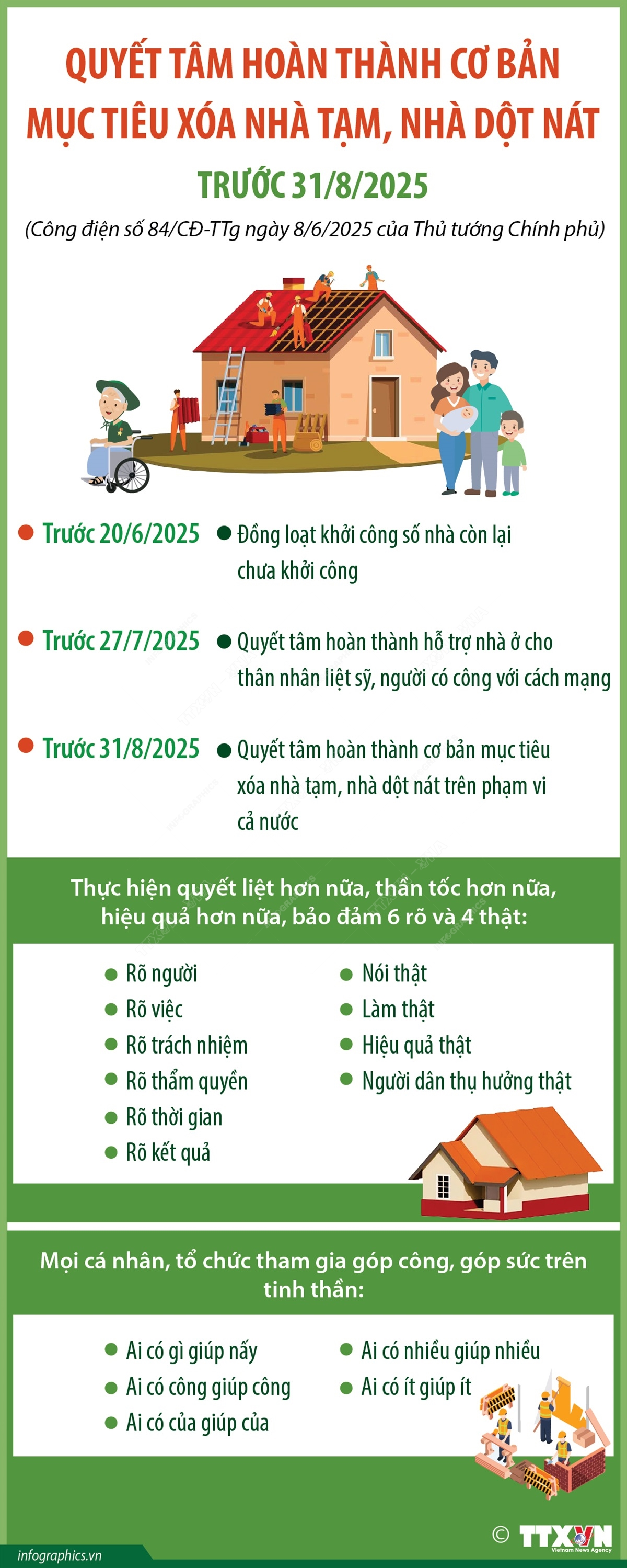 Thủ tướng Chính phủ Phạm Minh Chính yêu cầu các bộ ngành, địa phương quyết liệt hơn nữa, thần tốc hơn nữa, quyết tâm hoàn thành cơ bản mục tiêu xóa nhà tạm, nhà dột nát trên phạm vi cả nước trước ngày 31/8/2025; trong đó, hỗ trợ nhà ở cho thân nhân liệt sỹ, người có công với cách mạng, hoàn thành trước ngày 27/7/2025. Đây là nội dung Công điện số 84/CĐ-TTg ngày 8/6/2025 của Thủ tướng Chính phủ gửi bộ trưởng, thủ trưởng cơ quan ngang bộ, cơ quan thuộc Chính phủ; Trưởng Ban Chỉ đạo triển khai xóa nhà tạm, nhà dột nát các tỉnh, thành phố trực thuộc Trung ương về việc tập trung hoàn thành mục tiêu xoá nhà tạm, nhà dột nát trên phạm vi cả nước.