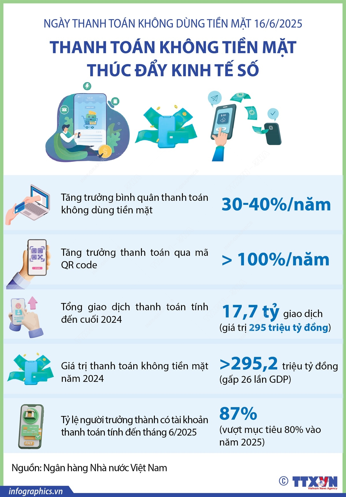 Sau sáu năm triển khai chương trình, thanh toán không tiền mặt tại Việt Nam tăng trưởng hết sức ấn tượng. Theo thống kê của Ngân hàng Nhà nước Việt Nam, đến cuối năm 2024, tổng thanh toán đạt 17,7 tỷ giao dịch với giá trị 295 triệu tỷ đồng, tăng trưởng 56% về số lượng và 32% về giá trị so với cuối năm 2023. Đến tháng 6/2025, tỷ lệ người trưởng thành có tài khoản thanh toán đạt 87%, vượt mục tiêu 80% vào năm 2025.