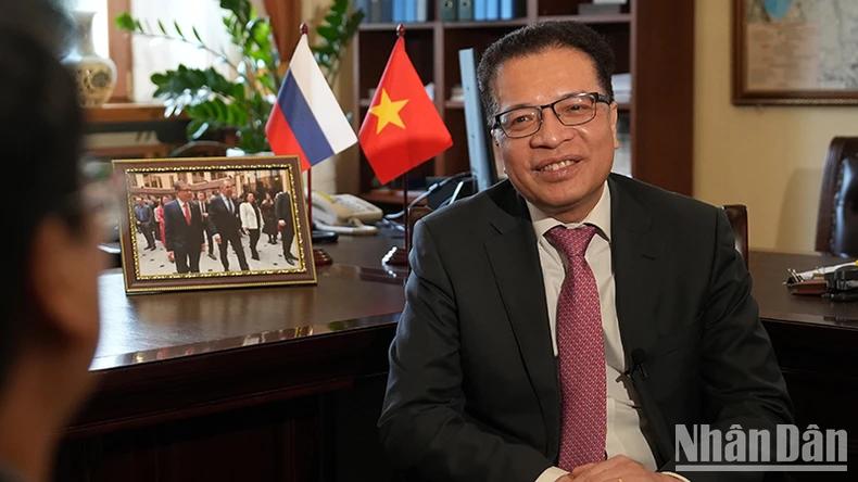 Đại sứ Việt Nam tại Liên bang Nga Đặng Minh Khôi trả lời phỏng vấn phóng viên Báo Nhân Dân thường trú tại Nga. (Ảnh: NGUYỄN HOÀNG).