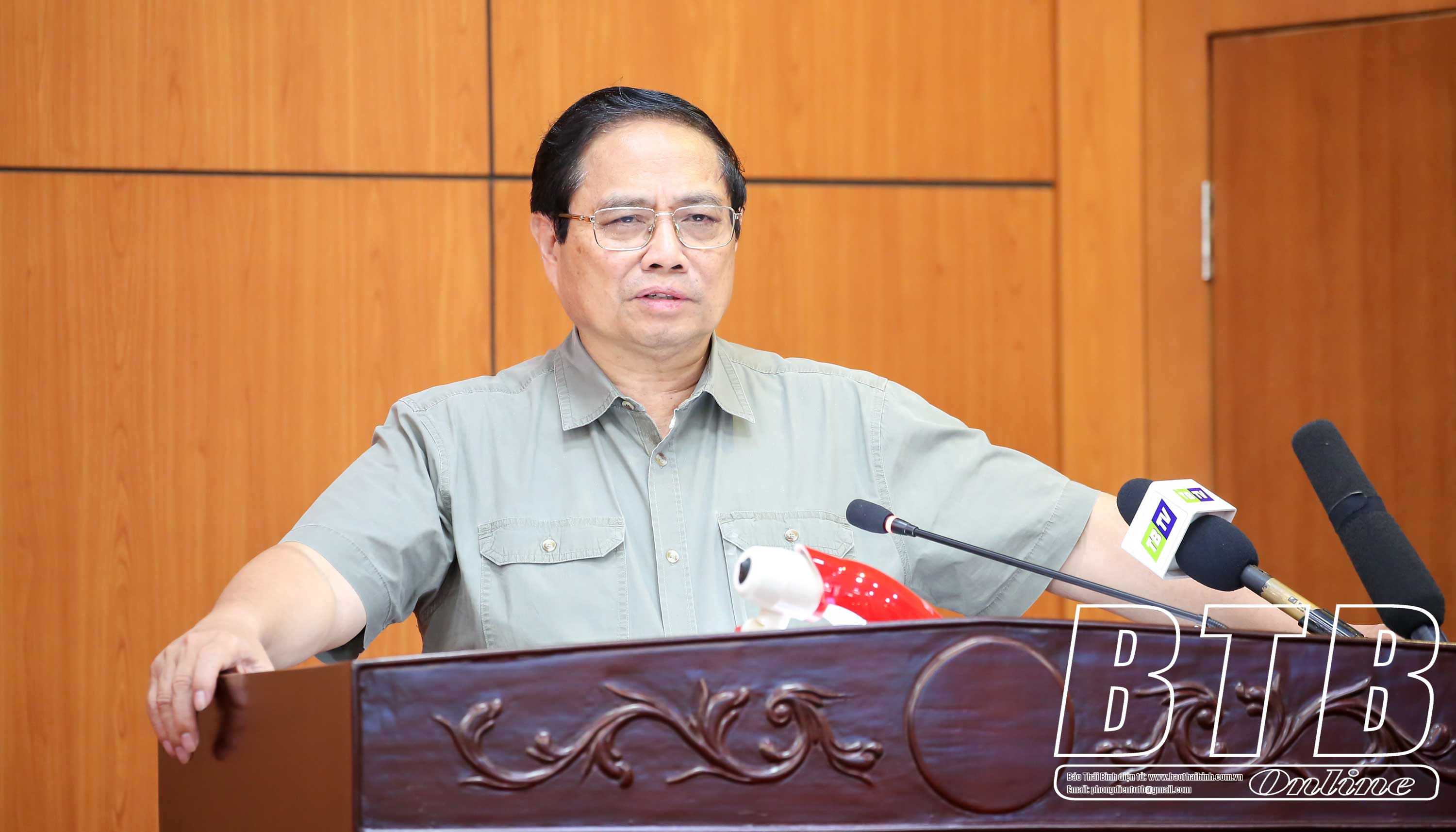 Phát biểu tại buổi làm việc, Thủ tướng Chính phủ Phạm Minh Chính ghi nhận, biểu dương những thành tích mà Đảng bộ, chính quyền và nhân dân tỉnh Thái Bình đã đạt được trong việc triển khai thực hiện Nghị quyết Đại hội XIII của Đảng; Nghị quyết Đại hội Đảng bộ tỉnh lần thứ XX từ đầu nhiệm kỳ đến nay, đặc biệt là tỉnh đã làm tốt công tác thu hút vốn đầu tư, giải ngân vốn đầu tư công, an sinh xã hội… Trên cơ sở đánh giá thuận lợi, khó khăn, tiềm năng, thách thức của tỉnh, Thủ tướng Chính phủ gợi mở định hướng trong thời gian tới mà Thái Bình cần rà soát, đánh giá lại cụ thể, chi tiết để nắm bắt hết tiềm năng, cơ hội, trên cơ sở những lợi thế, thế mạnh nổi trội của tỉnh để xây dựng các giải pháp phát triển kinh tế - xã hội vừa mang tính đột phá, vừa phù hợp với thực tế của tỉnh, tìm ra được đòn bẩy, điểm tựa để kinh tế của tỉnh bứt phá mạnh mẽ trong 5 năm tới, trước mắt là năm 2025, Thái Bình cần đạt mục tiêu tăng trưởng kinh tế 2 con số theo kế hoạch đã đề ra.