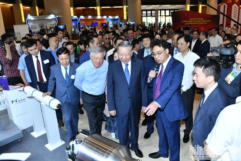 Tổng Bí thư Tô Lâm và các đại biểu tham quan triển lãm "Những thành tựu phát triển kinh tế tư nhân và các gian hàng trưng bày sản phẩm của các doanh nghiệp tư nhân". (Ảnh: ĐĂNG KHOA, THÙY CHI).