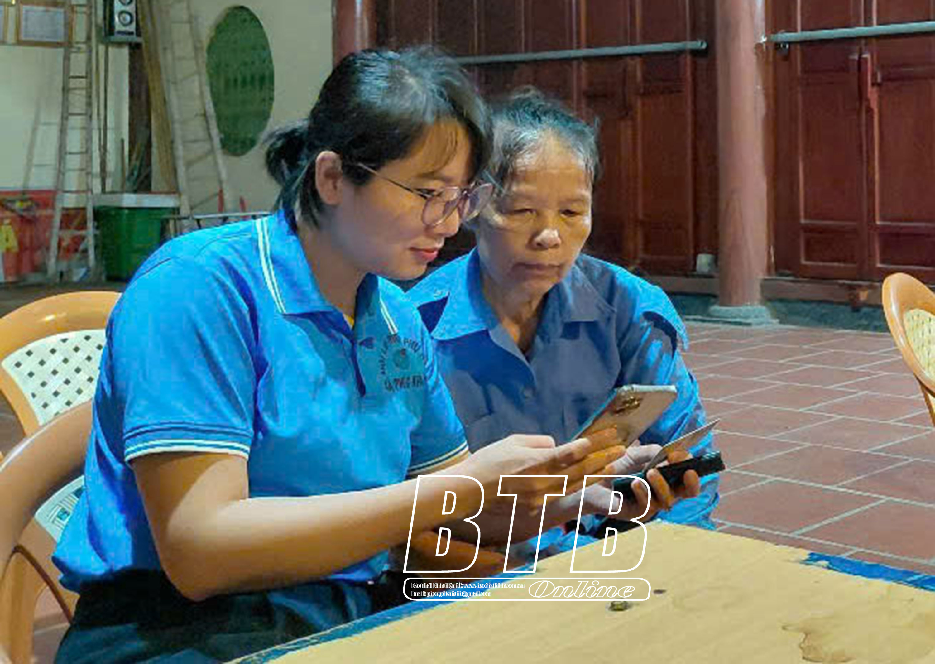 Cán bộ Hội LHPN xã Phúc Khánh hướng dẫn người dân góp ý vào dự thảo qua ứng dụng VNeID.