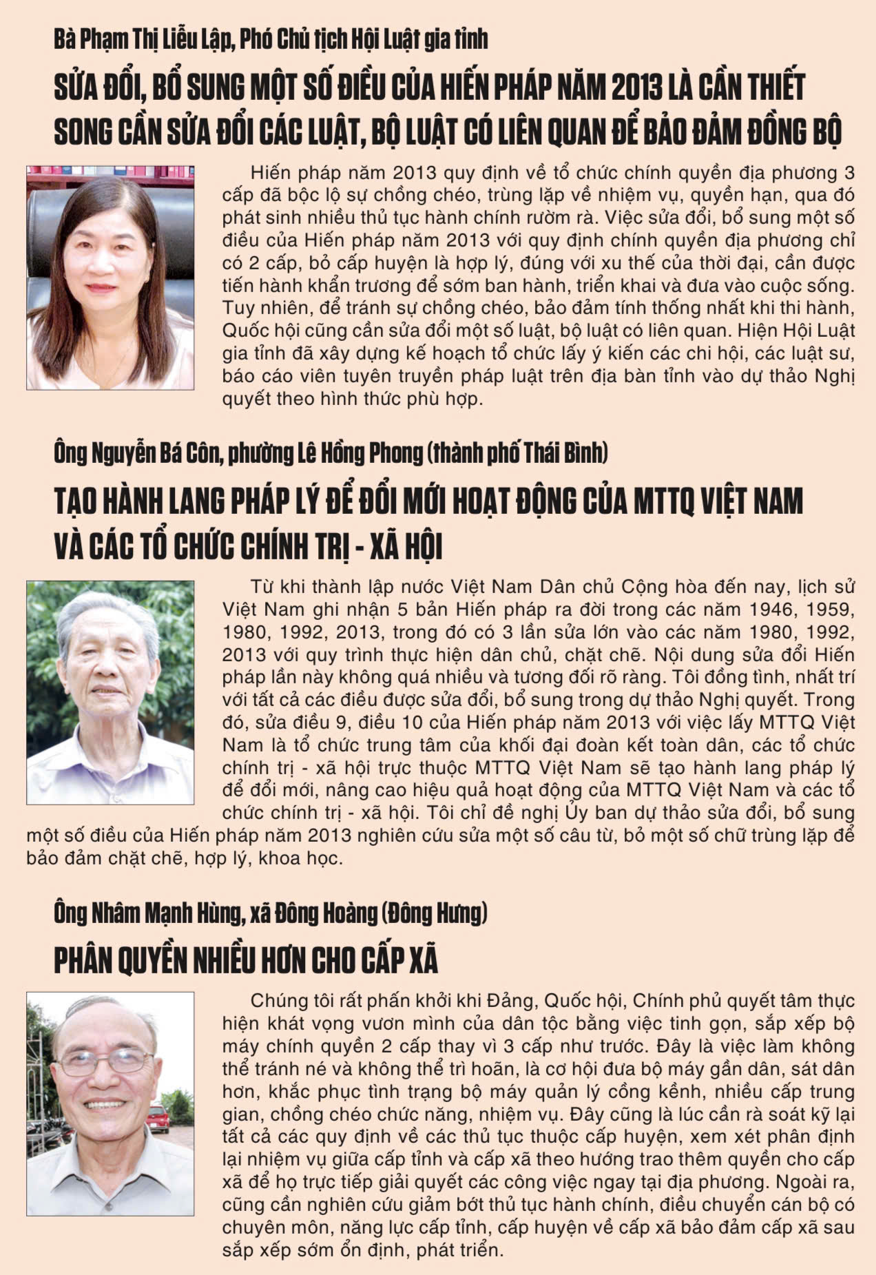 Việc lấy ý kiến nhân dân vào dự thảo Nghị quyết sửa đổi, bổ sung một số điều của Hiến pháp năm 2013 là nhiệm vụ chính trị đặc biệt quan trọng đang được các sở, ban, ngành, đơn vị, địa phương trong tỉnh khẩn trương triển khai, bảo đảm khách quan, khoa học, hiệu quả, phát huy quyền làm chủ của nhân dân, huy động trí tuệ, tâm huyết và tạo sự đồng thuận, thống nhất cao của toàn dân. Nhân dân đồng thuận cao, tích cực đóng góp ý kiến vào dự thảo Nghị quyết, phóng viên Báo Thái Bình đã lược ghi một số ý kiến tâm huyết của cán bộ, đảng viên, nhân dân.