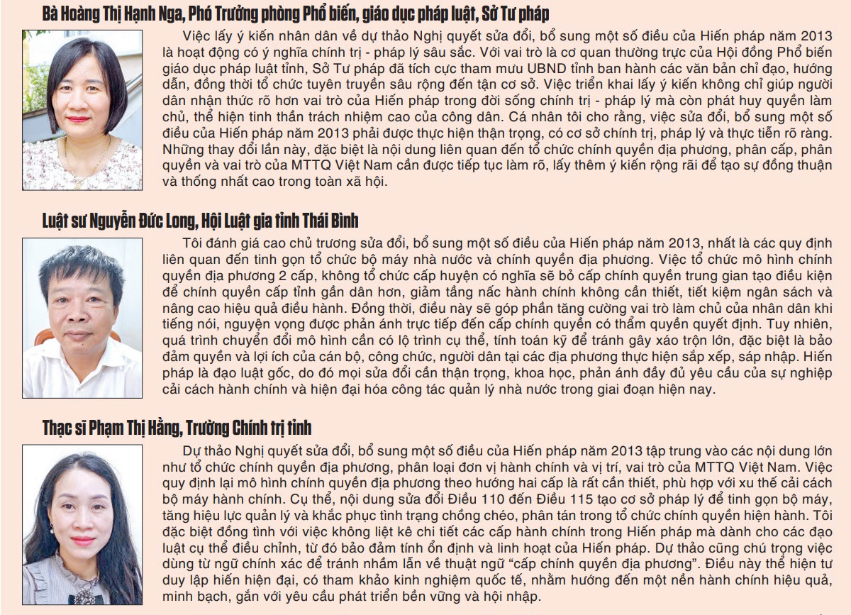 Tỉnh Thái Bình đang triển khai sâu rộng việc lấy ý kiến nhân dân về dự thảo Nghị quyết sửa đổi, bổ sung một số điều của Hiến pháp năm 2013. Đây là đợt sinh hoạt chính trị quan trọng, thu hút sự quan tâm và tham gia tích cực của các tầng lớp nhân dân. Đã có nhiều ý kiến tâm huyết, thể hiện trách nhiệm của mỗi công dân đối với tương lai của đất nước.