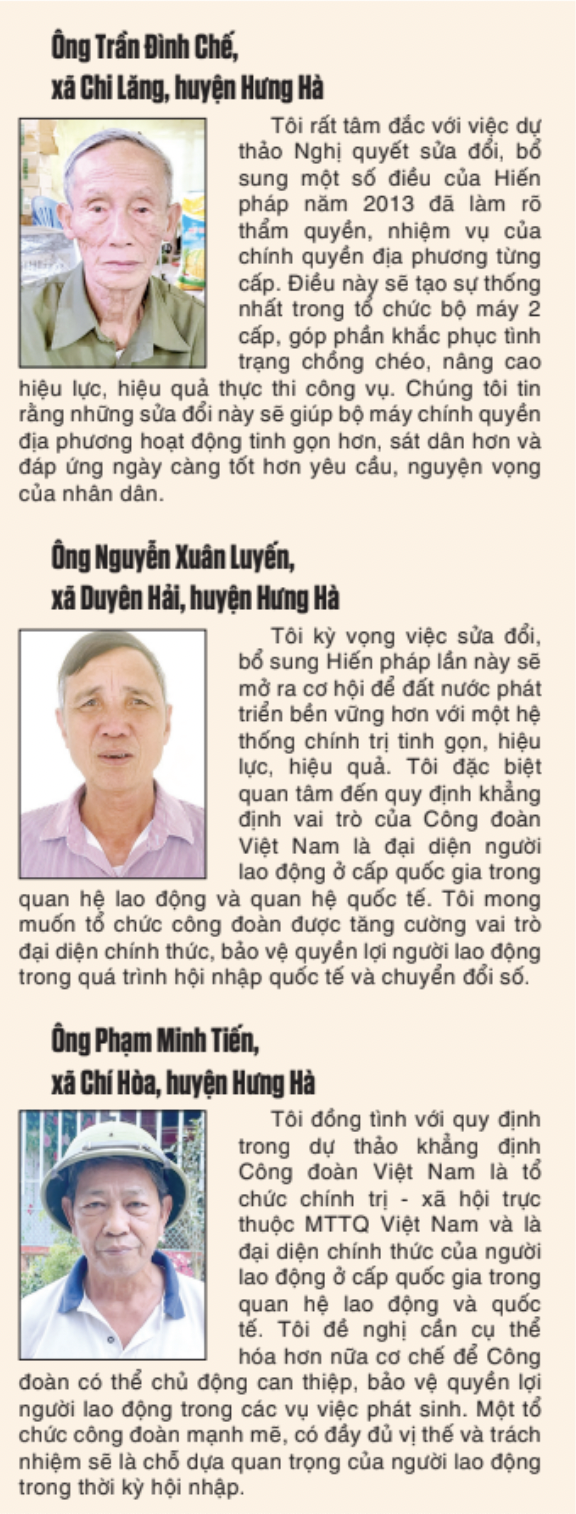 Với vai trò trung tâm trong khối đại đoàn kết dân tộc, Ủy ban MTTQ huyện Hưng Hà đã chủ động phối hợp với các phòng, ban, đơn vị chuyên môn và các xã, thị trấn để tổ chức lấy ý kiến một cách khoa học, công khai, minh bạch. Bà Nguyễn Thị Lệ Hà, Chủ tịch Ủy ban MTTQ huyện cho biết: Tính đến thời điểm giữa tháng 5, toàn huyện đã tiếp nhận và tổng hợp hàng chục nghìn ý kiến từ cán bộ, đảng viên, đoàn viên, hội viên và các tầng lớp nhân dân nhất trí với dự thảo Nghị quyết. Một số ý kiến góp ý tập trung vào những điều khoản liên quan đến quyền, nghĩa vụ công dân; tổ chức bộ máy nhà nước; cơ chế phân quyền, giám sát giữa Trung ương và địa phương... đã phản ánh sâu sắc tâm tư và kỳ vọng của người dân đối với việc sửa đổi, bổ sung một số điều của Hiến pháp năm 2013.