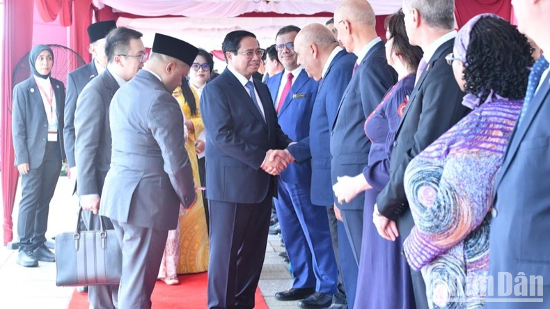 Thủ tướng Phạm Minh Chính với các Đại sứ, Trưởng cơ quan đại diện ngoại giao tại Malaysia tham dự Lễ đón chính thức. (Ảnh: THANH GIANG).