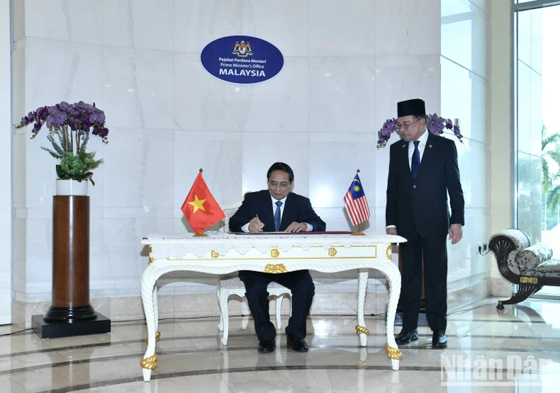 Thủ tướng Anwar Ibrahim mời Thủ tướng Phạm Minh Chính vào sảnh để thưởng thức biểu diễn múa truyền thống của Malaysia. Sau đó Thủ tướng Phạm Minh Chính đã ký vào sổ lưu niệm.