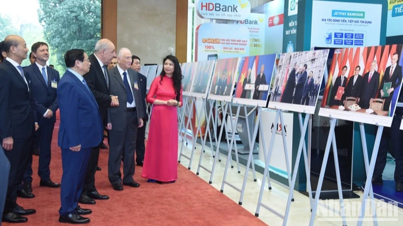 Thủ tướng Phạm Minh Chính giới thiệu với Tổng thống Hungary Sulyok Tamas gian trưng bày ảnh về quan hệ hai nước. (Ảnh:TRẦN HẢI).