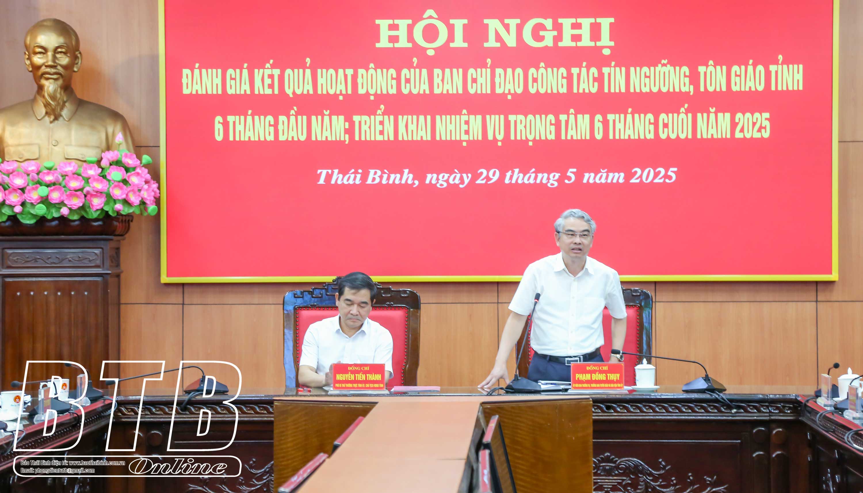 Chiều ngày 29/5, Ban Chỉ đạo (BCĐ) công tác tín ngưỡng, tôn giáo tỉnh tổ chức hội nghị đánh giá kết quả hoạt động 6 tháng đầu năm, triển khai nhiệm vụ trọng tâm 6 tháng cuối năm 2025. Đồng chí Nguyễn Tiến Thành, Phó Bí thư thường trực Tỉnh ủy, Chủ tịch HĐND tỉnh, Trưởng BCĐ tỉnh chủ trì hội nghị.