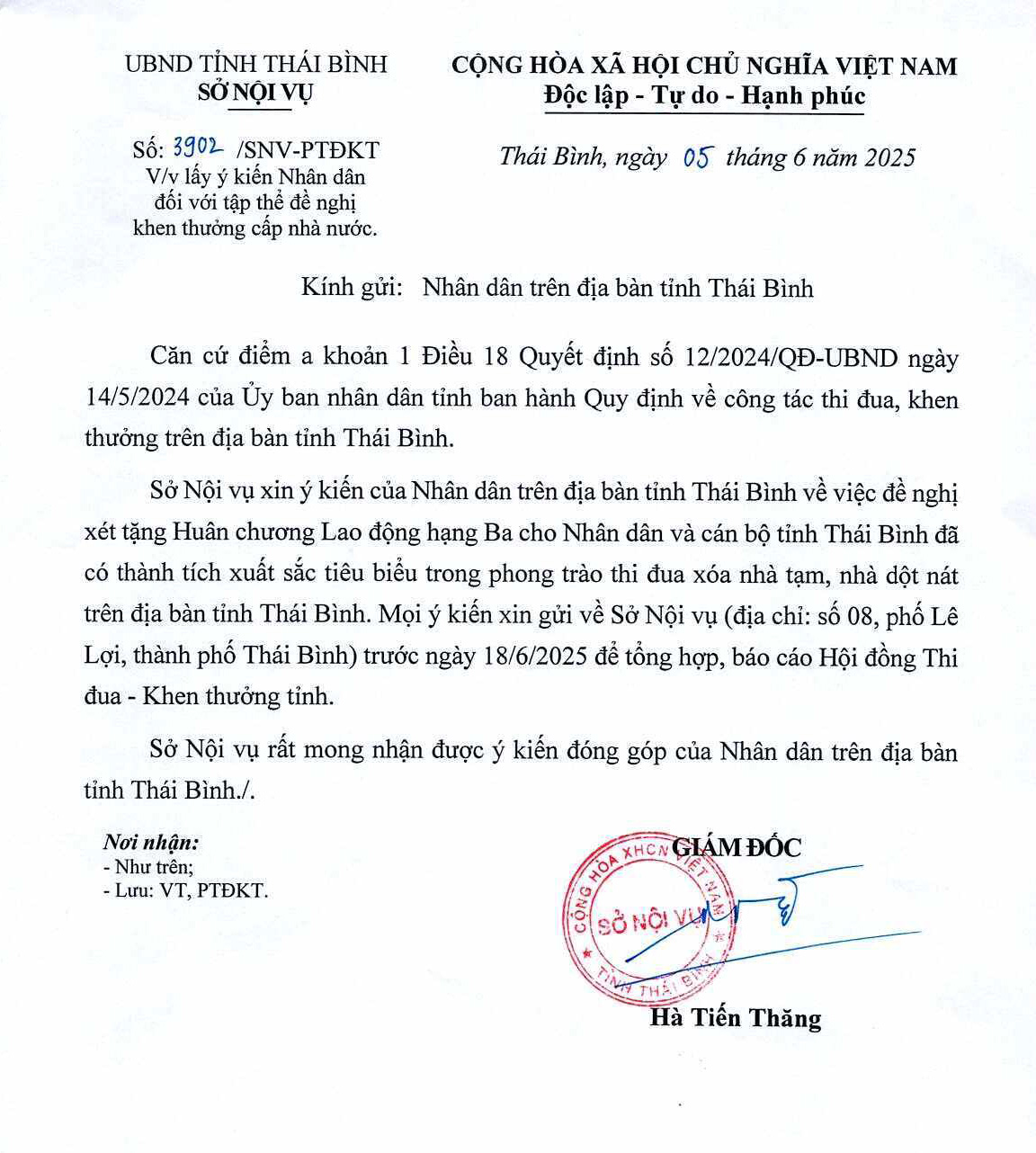 Căn cứ khoản 2 Điều 46 Nghị định số 98/2023/NĐ-CP ngày 31/12/2023 của Chính phủ quy định chi tiết thi hành một số điều của Luật Thi đua, khen thưởng; điểm a khoản 1 Điều 18 Quyết định số 12/2024/QĐ-UBND ngày 14/5/2024 ban hành Quy định về công tác thi đua, khen thưởng trên địa bàn tỉnh Thái Bình về việc lấy ý kiến Nhân dân đối với các tập thể, cá nhân đề nghị xét tặng hình thức khen thưởng Huân chương trên các phương tiện truyền thông thuộc tỉnh. Báo Thái Bình đăng tải văn bản lấy ý kiến Nhân dân tham gia đóng góp về việc đề nghị xét tặng Huân chương Lao động hạng Ba cho Nhân dân và cán bộ tỉnh Thái Bình đã có thành tích xuất sắc tiêu biểu trong phong trào thi đua xóa nhà tạm, nhà dột nát trên địa bàn tỉnh Thái Bình.