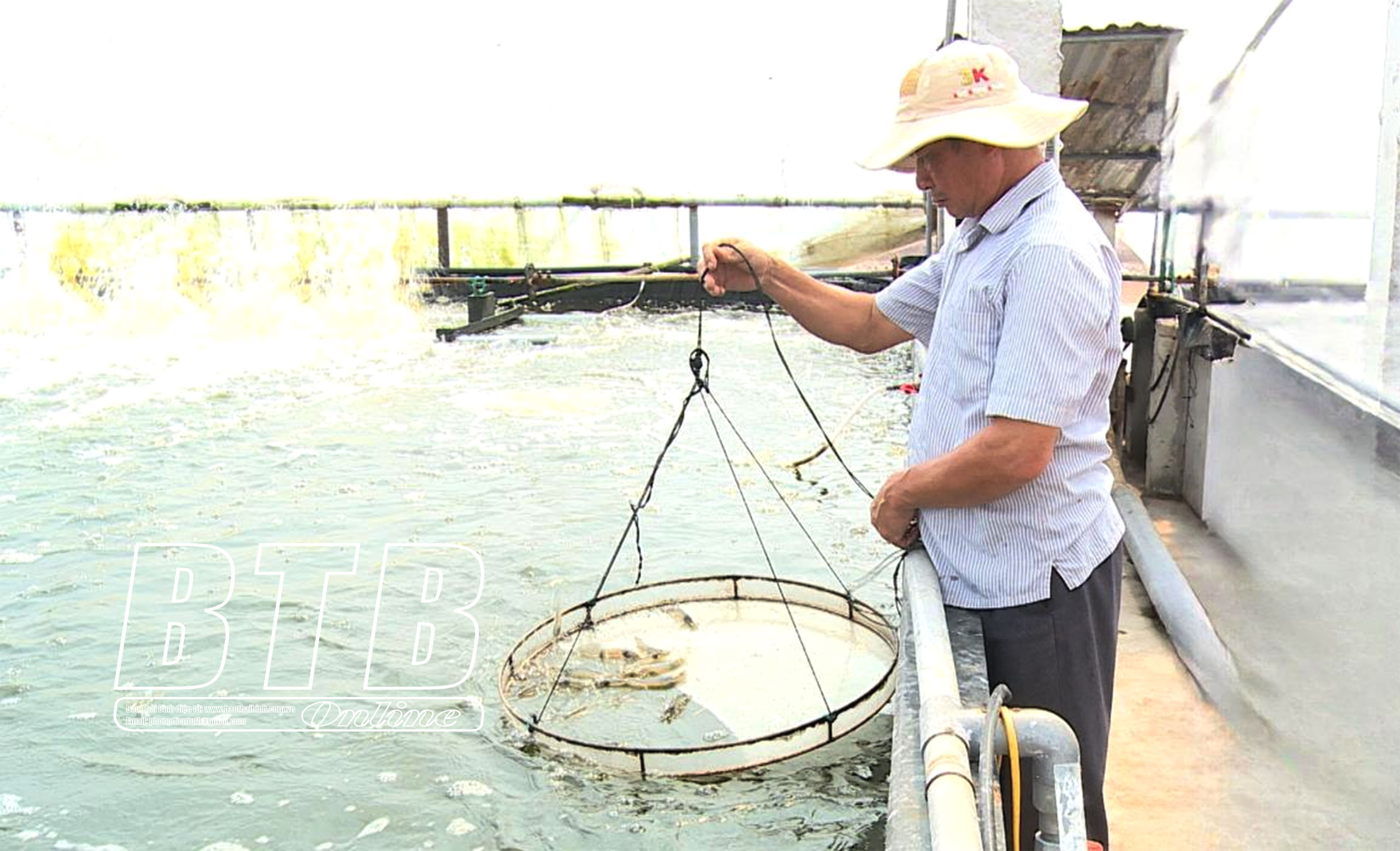 Ông Đào Văn Hiền, xã Đông Minh (Tiền Hải), kiểm tra sự sinh trưởng của tôm thẻ được nuôi theo mô hình công nghệ cao.