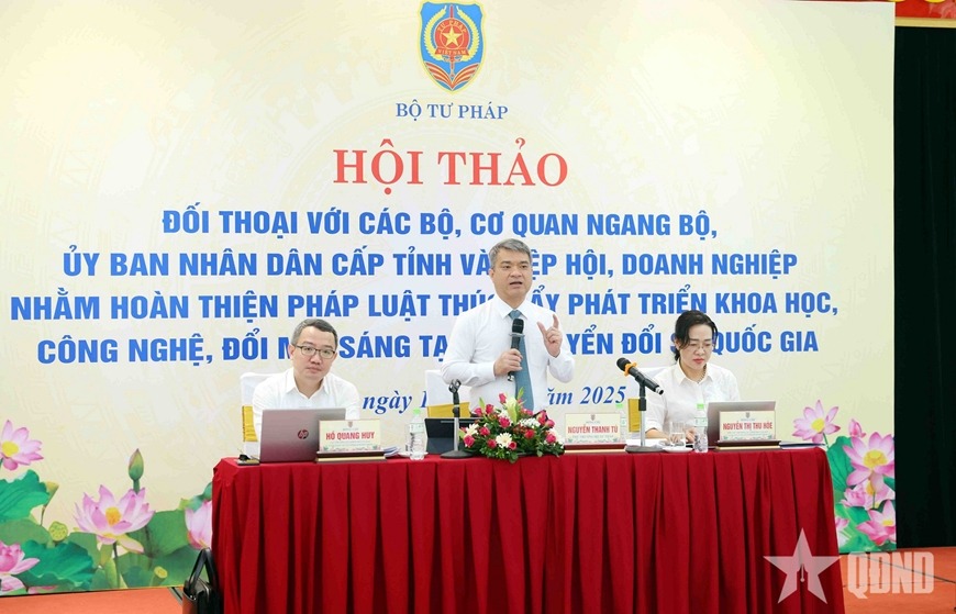 Trên cơ sở báo cáo của Bộ Tư pháp, hội thảo đã được nghe các ý kiến phát biểu, đối thoại, trao đổi thẳng thắn của đại diện các bộ, cơ quan ngang bộ, UBND cấp tỉnh, hiệp hội, doanh nghiệp, nhằm đi tới hoàn thiện pháp luật, thúc đẩy phát triển khoa học, công nghệ, đổi mới sáng tạo và chuyển đổi số quốc gia.