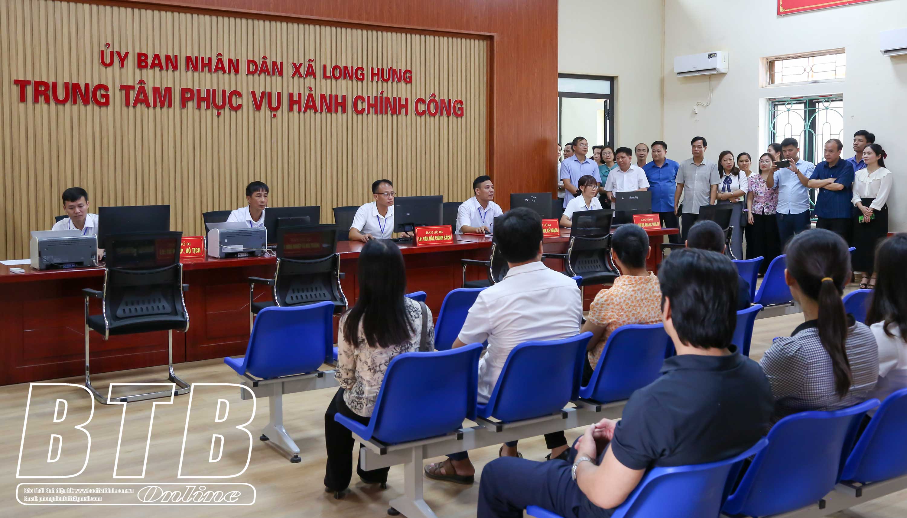 Các đồng chí: Nguyễn Khắc Thận, Bí thư Tỉnh ủy; Nguyễn Mạnh Hùng, Phó Bí thư Tỉnh ủy, Chủ tịch UBND tỉnh và đại biểu kiểm tra vận hành Trung tâm phục vụ hành chính công xã Long Hưng (sau sáp nhập).