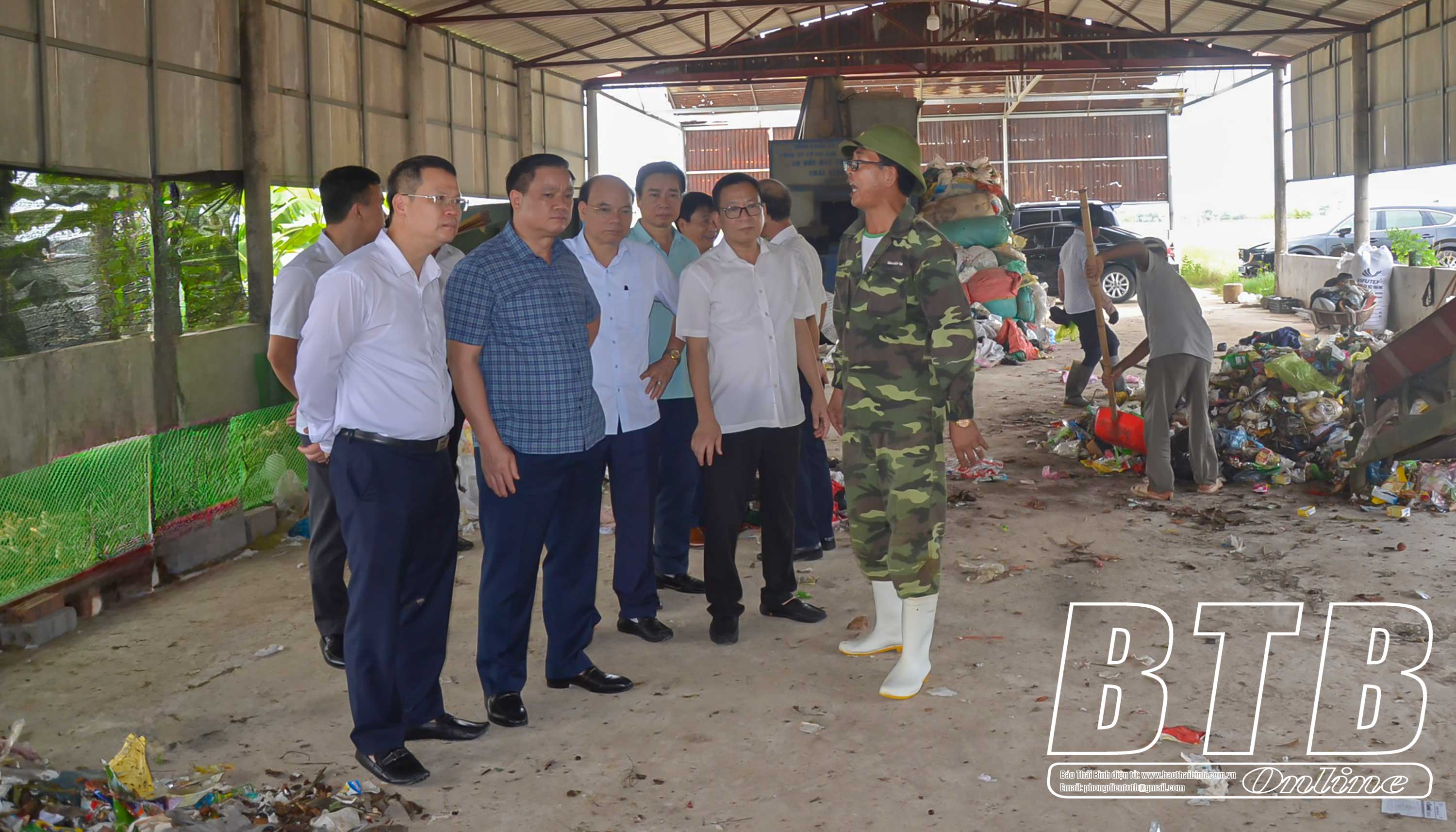 Các đồng chí: Nguyễn Khắc Thận, Bí thư Tỉnh ủy; Nguyễn Mạnh Hùng, Phó Bí thư Tỉnh ủy, Chủ tịch UBND tỉnh và đại biểu tham quan mô hình xử lý rác thải tại xã Thái Hưng.