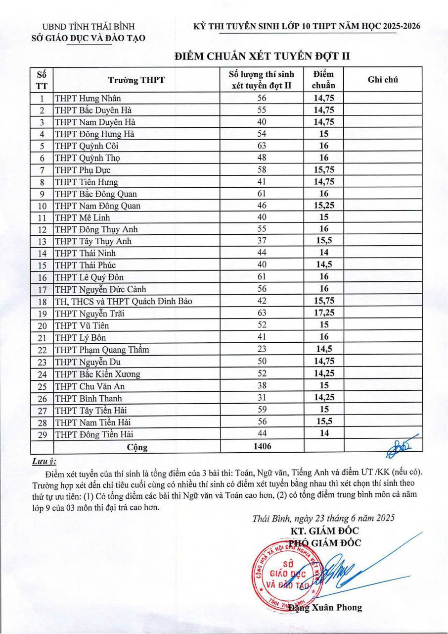 Điểm chuẩn xét tuyển đợt 2 vào các trường THPT công lập tại Thái Bình năm học 2025-2026.