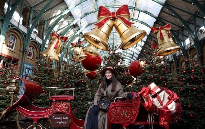 Một cô gái trẻ đẹp tạo dáng chụp ảnh ở chợ Giáng sinh tại London, Anh.