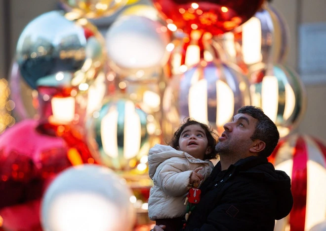 Hai cha con ngắm nhìn đồ trang trí Giáng sinh trên đường phố thành phố Rome, Italy.