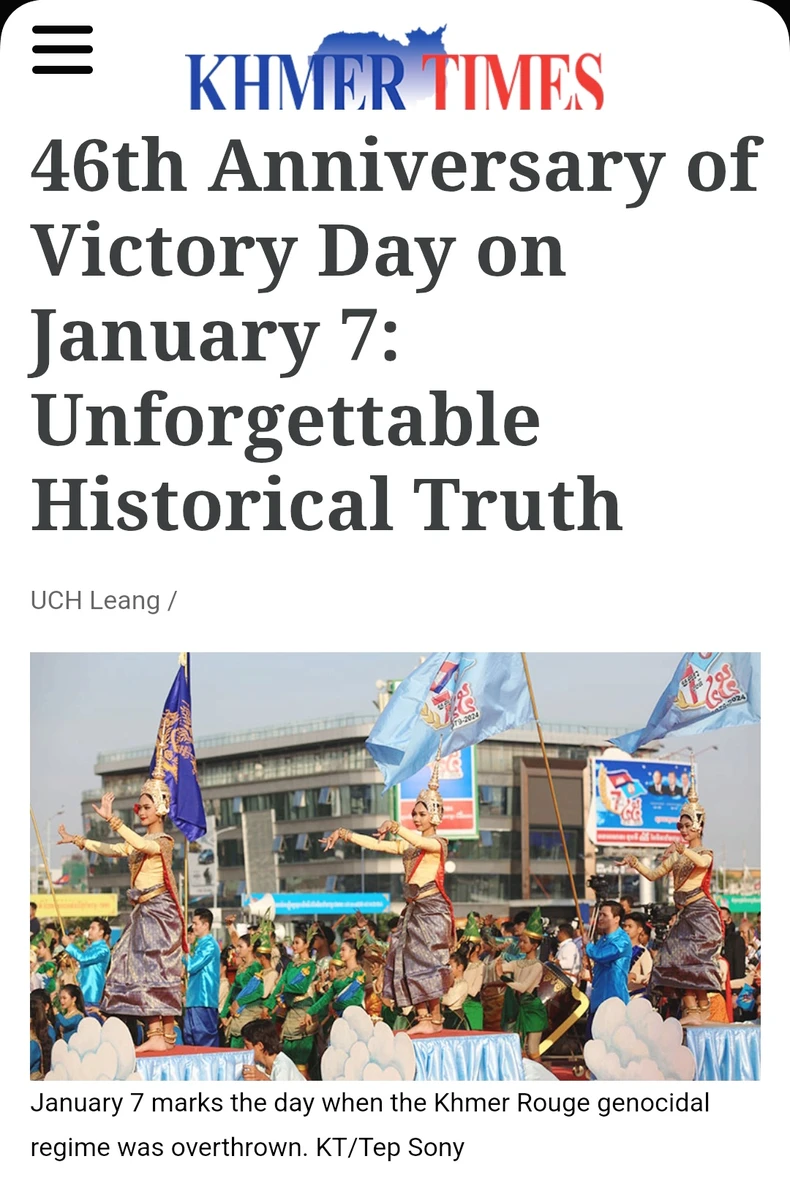 Bài viết ”Kỷ niệm 46 năm Chiến thắng 7/1: Sự thật lịch sử không thể lãng quên” của tác giả Uch Leang đăng trên trang điện tử có số lượng độc giả đông đảo Khmer Times, cho biết, Chiến thắng lịch sử 7/1 đã kịp thời giải cứu hơn 5 triệu người dân Campuchia khỏi chế độ diệt chủng tàn bạo do Pol Pot cầm đầu.