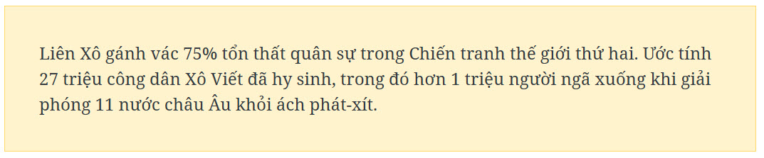 Khoảng 70 quốc gia bị cuốn vào cuộc chiến kéo dài 6 năm đẫm máu nhất trong lịch sử nhân loại này, với hơn 60 triệu người đã thiệt mạng. Để đi đến Ngày Chiến thắng, nhân dân Liên Xô đã phải chịu những hy sinh, mất mát to lớn, những tổn thất không thể bù đắp. Liên Xô gánh vác 75% tổn thất quân sự trong Chiến tranh thế giới thứ hai. Ước tính 27 triệu công dân Xô Viết đã hy sinh, trong đó hơn 1 triệu người ngã xuống khi giải phóng 11 nước châu Âu khỏi ách phát-xít.