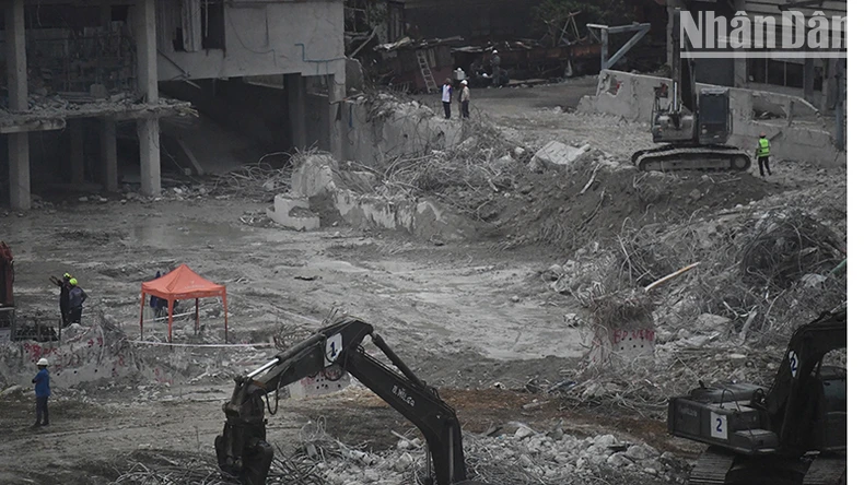 Tòa nhà 30 tầng đổ sụp tạo thành đống đổ nát cao hơn 5 tầng chôn vùi các nạn nhân bên trong. Ảnh: Xuân Sơn.