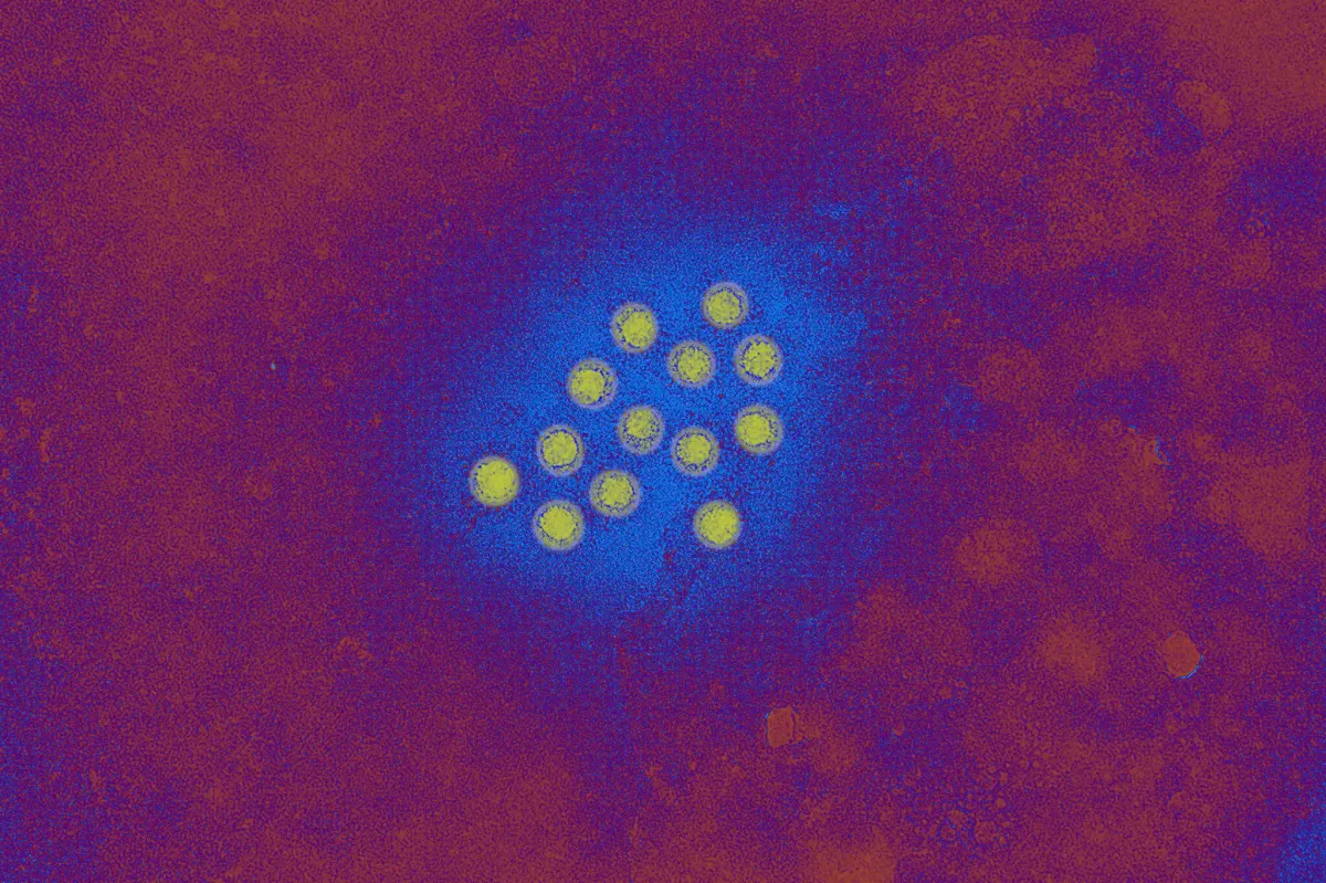 Ảnh chụp bằng kính hiển vi điện tử truyền màu của một cụm nhỏ virus viêm gan A.