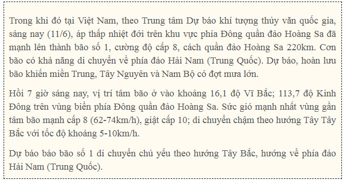 Ngày 11/6, tỉnh đảo Hải Nam, Trung Quốc đã duy trì cảnh báo bão cấp IV sau khi một vùng áp thấp nhiệt đới trên Biển Đông đã phát triển thành cơn bão đầu tiên trong năm nay, tên quốc tế là Wutip (bão số 1).